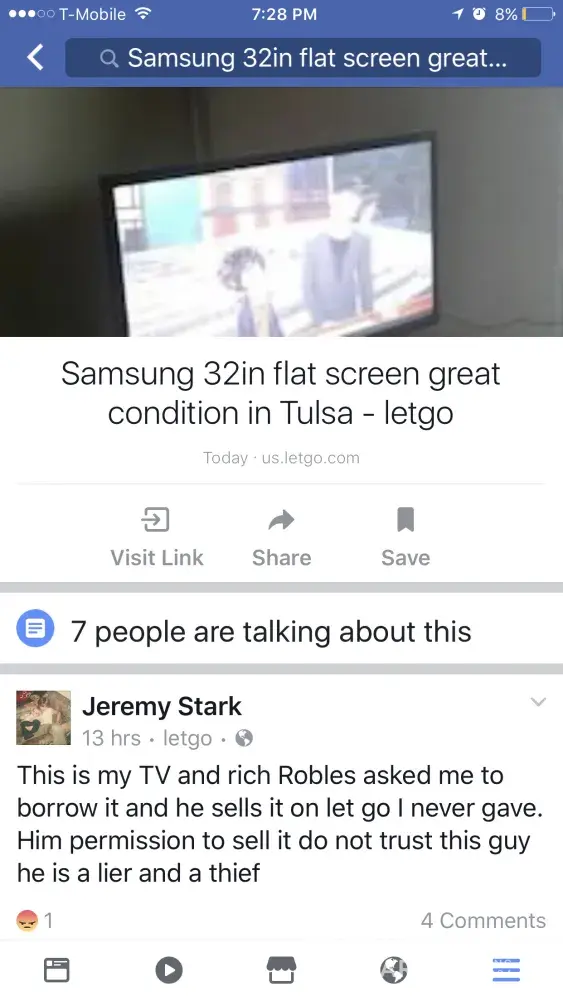 I don't know who I need to talk to you but I'm letting you know that Rich Robles is selling a stolen 32 inch flat screen Samsung TV on your website it has been reported stolen . Please call me at [protected] I'd really appreciate it I would like to know if you could take it down or block it from being sold.
