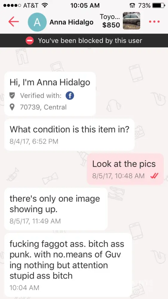 See attached picture. This response came out of nowhere. I truly hope this user is no longer able to use this app and speak to people this way. Thank you.