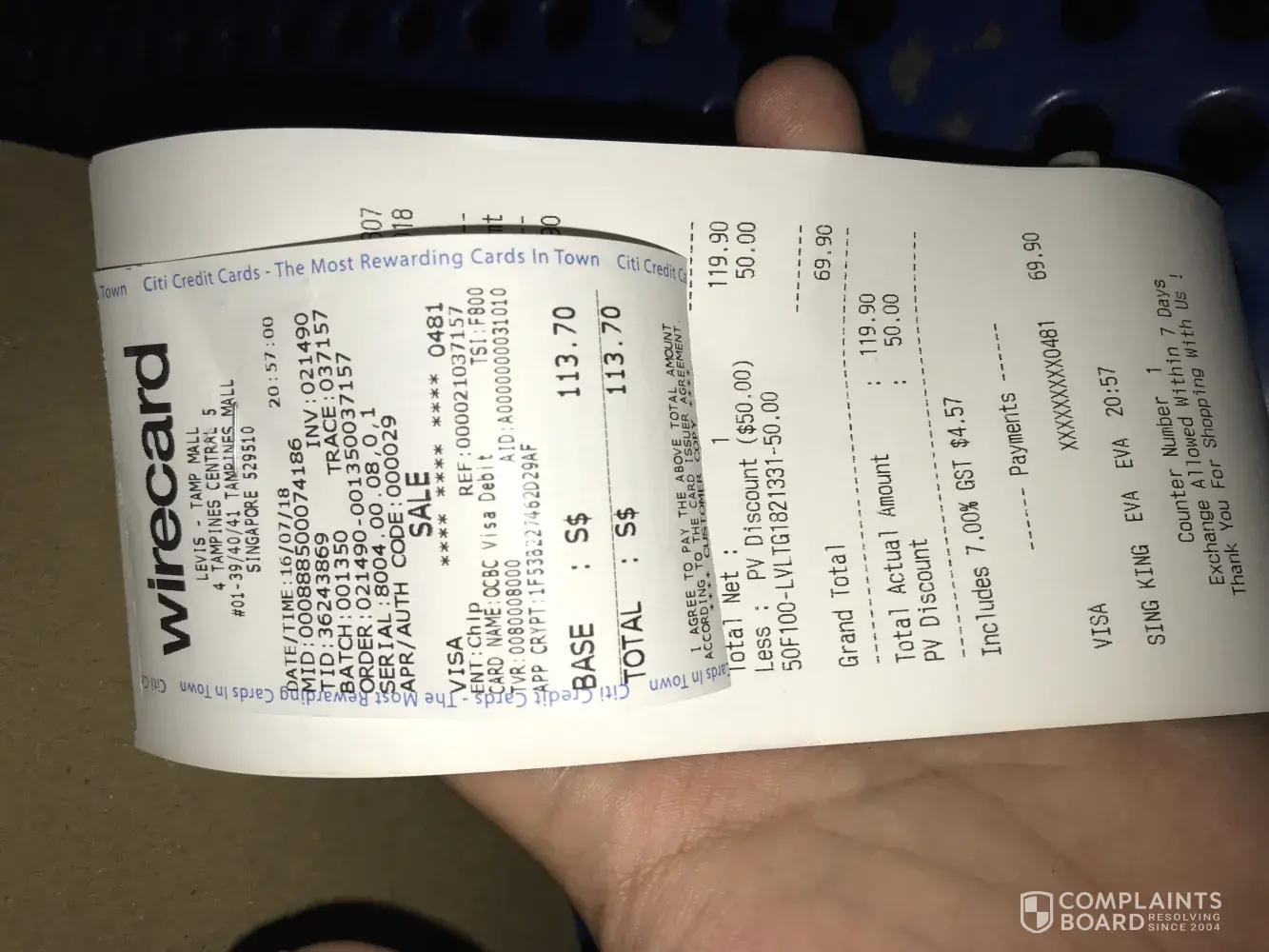 But your staff at Tampines Mall told me that there was a free gift for a belt and a sock. I gladly accept it, but when I got home and check the reciept it only got one item which is my jeans with no indication that the other two items are free gifts stated in the reciept. Yet my card was charged at $113.70. Which my purpose for today is to get and explainantion and also a refund for the extra $44 that I paid for nothing,