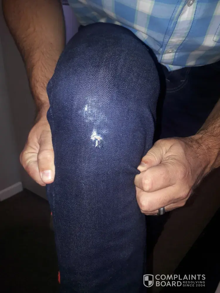 Attached photos of my husbands brand new Levi 511. Only worn 3 or 4 times. The material seems to have a defect - it just starts forming holes/rips in the jean - not even over the parts that is stretched (like over the knees). He only wears it to office which is a sit down job - thus not heavy duty!
