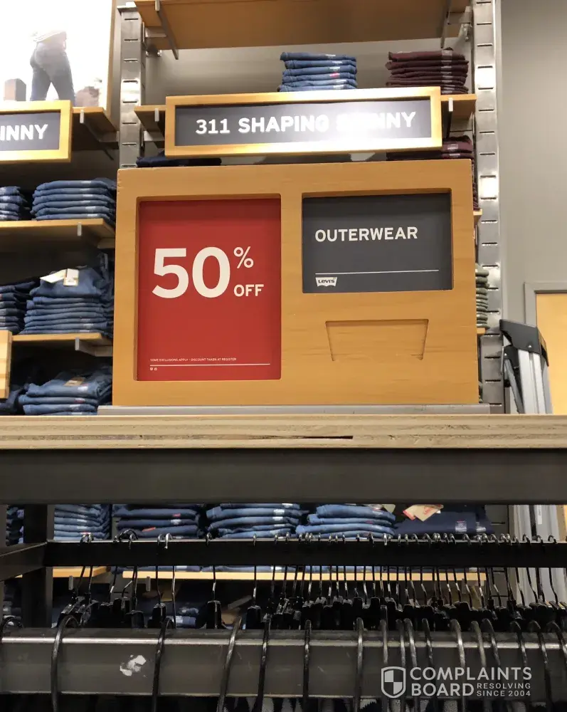 On december 31, 2017 my daughter, sister and I went to the tulalip outlet mall levi store in washington state. Upon entering the store we were delighted to see a sign that read 50% off outerwear. We spent a significant amount of time going through the jackets and after selecting 3 we went up to the cash register to pay. All 3 jackets rang up at full price. I pointed out the 50% off outerwear sign to both the sale associates that were present. After checking the sign, which you could clearly see from the registers, they told me they would give me 50% off one jacket, the one hanging nearest the sign. I pointed out that the sign did not say 50% off select outerwear it said 50% off outerwear. Period. Which any reasonable person would assume meant all outwear was on sale. Because we didn't want to make a fuss we left the store with 1 jacket that was 50% off and 2 that we paid full price for. We all felt like we had been victims of a bait and switch. The associates should have honored the sale advertised on the sign. Very unethical buisness practices. A big disappointment.