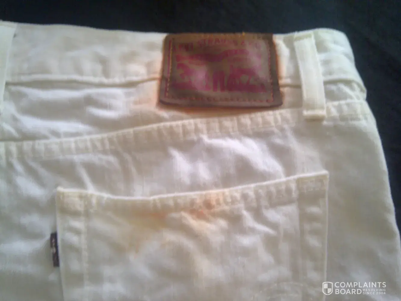 Purchased levi shorts from levis shop in milton keynes central shopping centre. Washed in cold water on delicate cycle with only white clothes as directed on the label. The dye has run from the label with red/orange dye all over the shorts., how can this be resolved? I also believed levis was a quality brand.