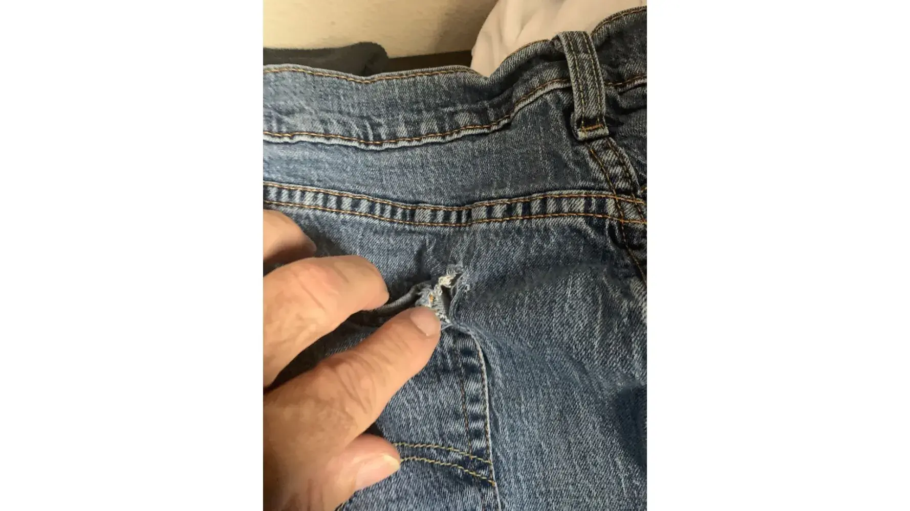 I recently purchased four pairs of Levi’s from Walmart about to months ago. I wear them for work about 3 days a week. Will last night I vent over and they tripped where my thigh was. I was like OK one pair down three to go. Well tonight my second pair ripped! But this time strait up my butt. I had to leave work. Please try making them material holding them