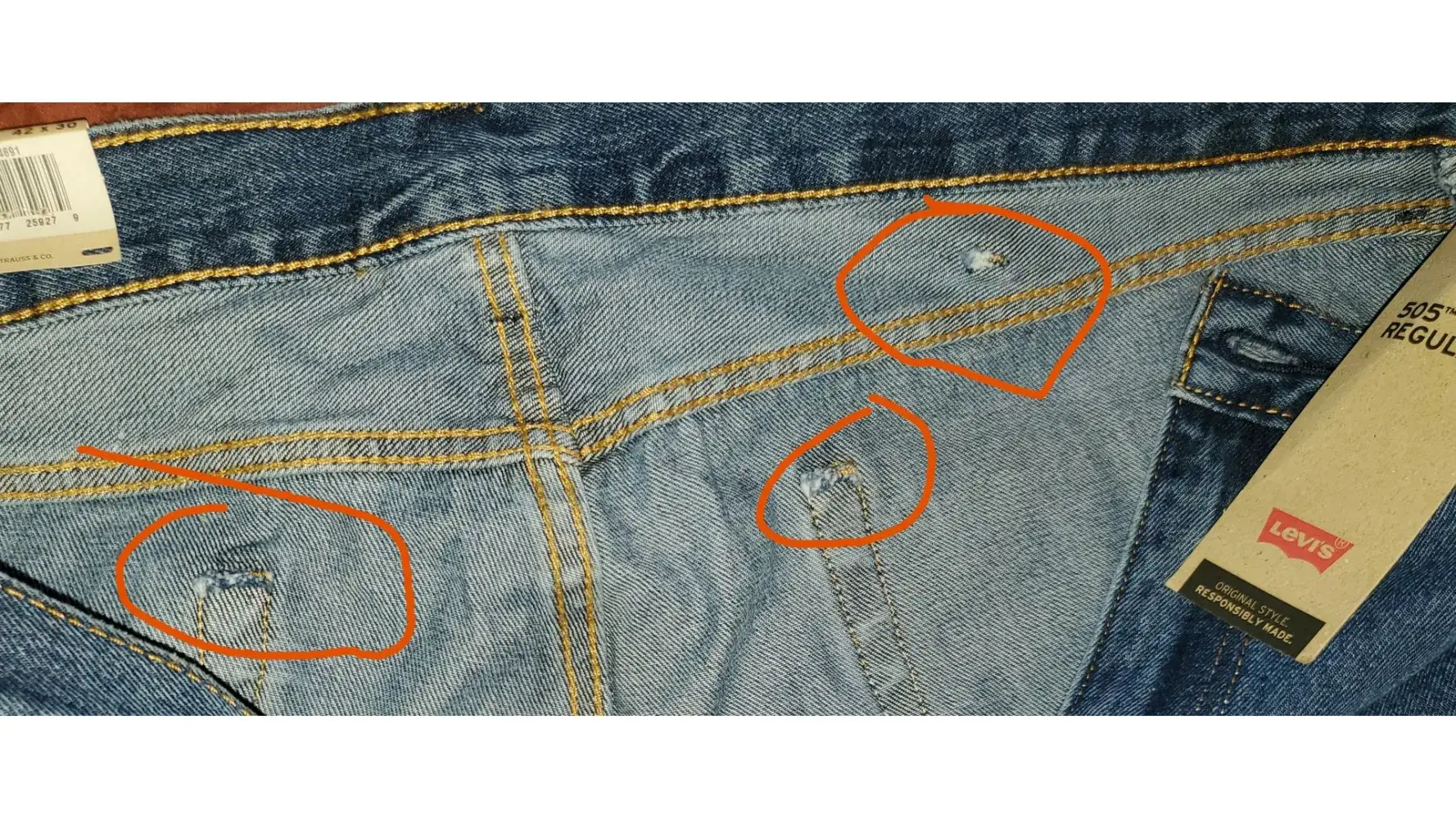 I have been wearing Levis 505, 569 and when younger the 517 jeans for over 40 years. Over the past 3 years Levis' product has reached a low, almost to the level of useless rags. I just found this site and felt maybe someone needs to inform Levis of the quality before they found out but closing their doors. I have had 569 jeans completely ripped the bottom out at 2 days old, I exchanged them at JC Pennys and the next pair did the exact same thing in the same spot so I threw them in the trash. I then switched to Levis 505. Now the 505's have a whole new problem - I have multiple jeans (4 pairs) with the belt loop thread ripped a hole through the material, two of the jeans have two rear belt loops rip through the jeans and leave holes in the seat/waist. I have more pictures if needed. One pair actually still has the new Levis' tags on it.