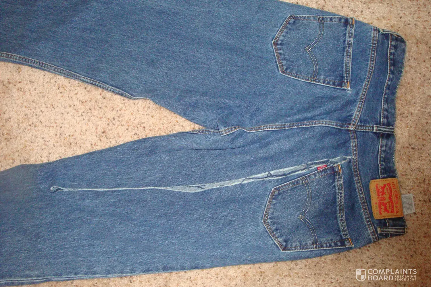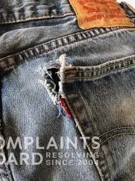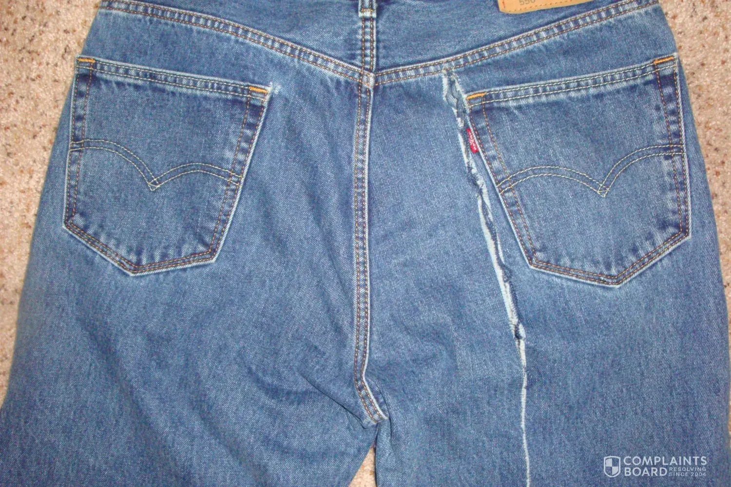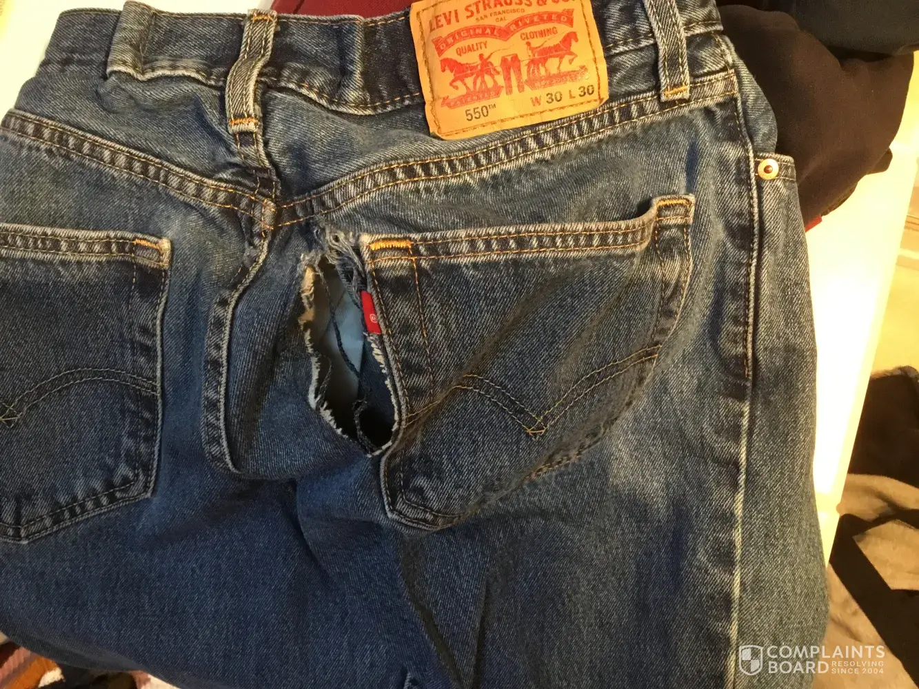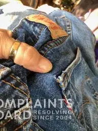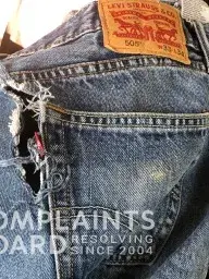 I purchased ten pair of Levi Strauss 505 jeans for my husband. All ten pair within a month have started tearing at the right back pocket. One pair, I could understand, but all ten? The other day he bent over and the whole rear end ripped down the length of the right pocket. They were purchased at Kohls and JCPenny and I was instructed to contact Levis Strauss Co which I did and now have to pay for the shipping of the 10 pairs of defective jeans which is going to cost a fortune. Since they were Levi's and are expensive jeans I didn't anticipate having to returning them. Levis should take the pictures of the defective jeans and send a refund the customer instead of all this hassle of coming up with the funds to pay for shipping and waiting for them to decide whether they're defective. Obviously they are because I am not the only customer complaining. Here is an example of what his jeans look like.