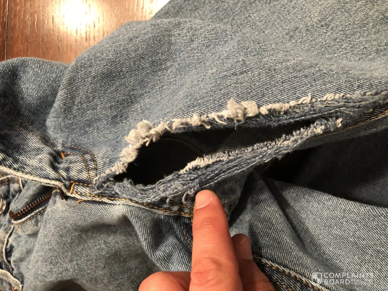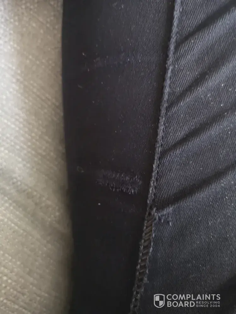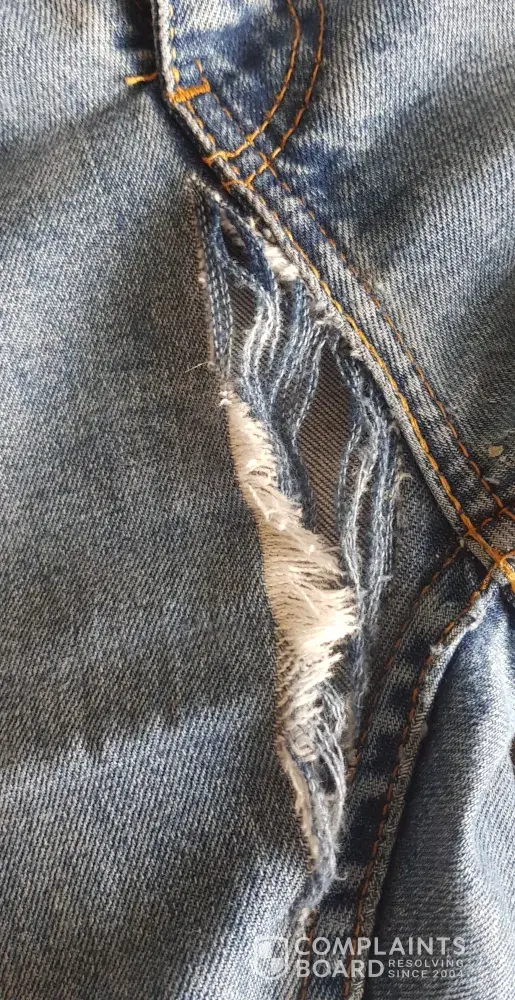 Contacted Levi's customer service to report the problem with photos...the response below; 2yr warranty, send them to us (of course at the customer's cost), etc. And maybe we'll make it right, if not however Levi's won't send the jeans back unless customer pays! This is not the first time I have unknowingly bought defective jeans - several years ago they developed holes around the back pockets after only 2-3 wearing/washings!