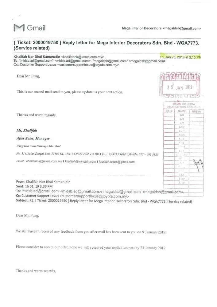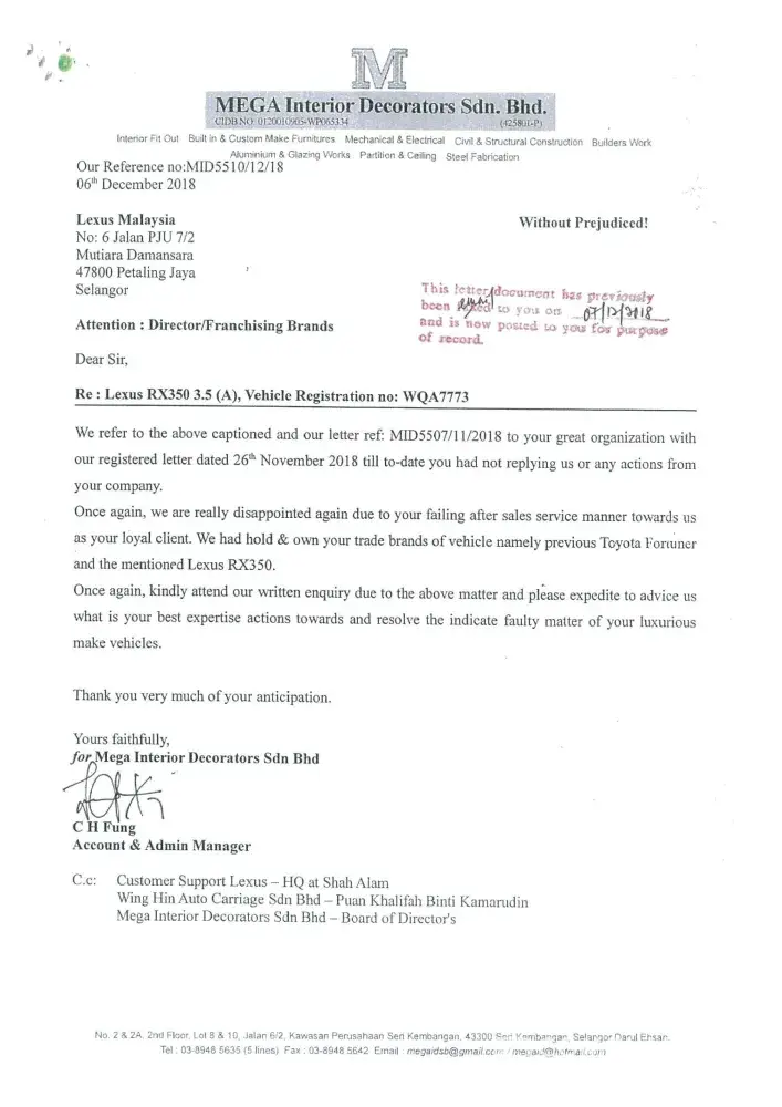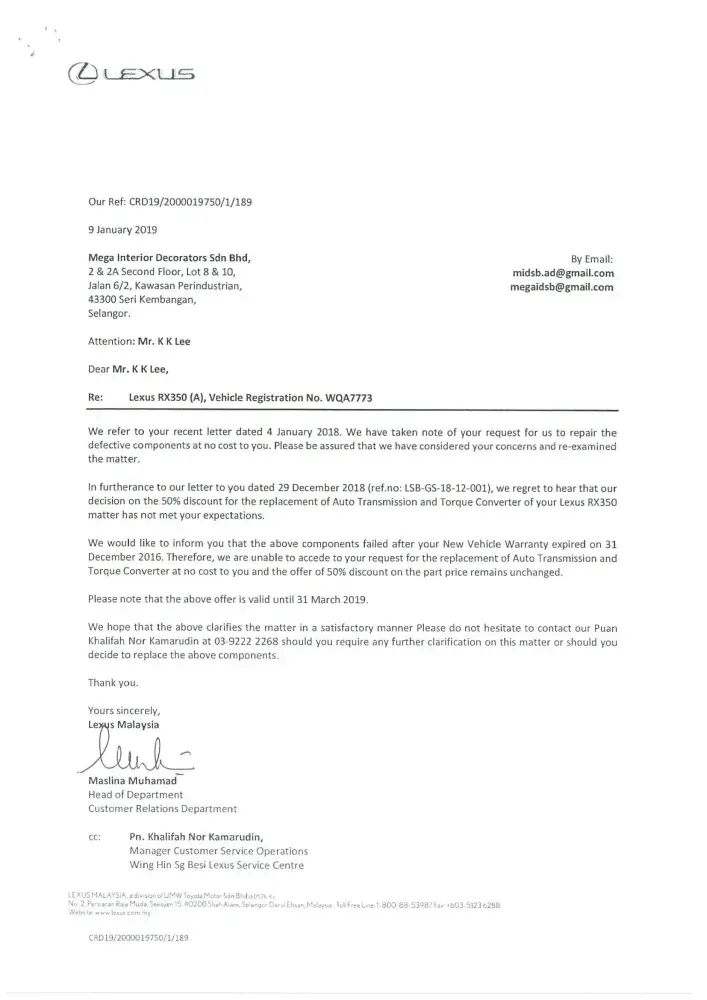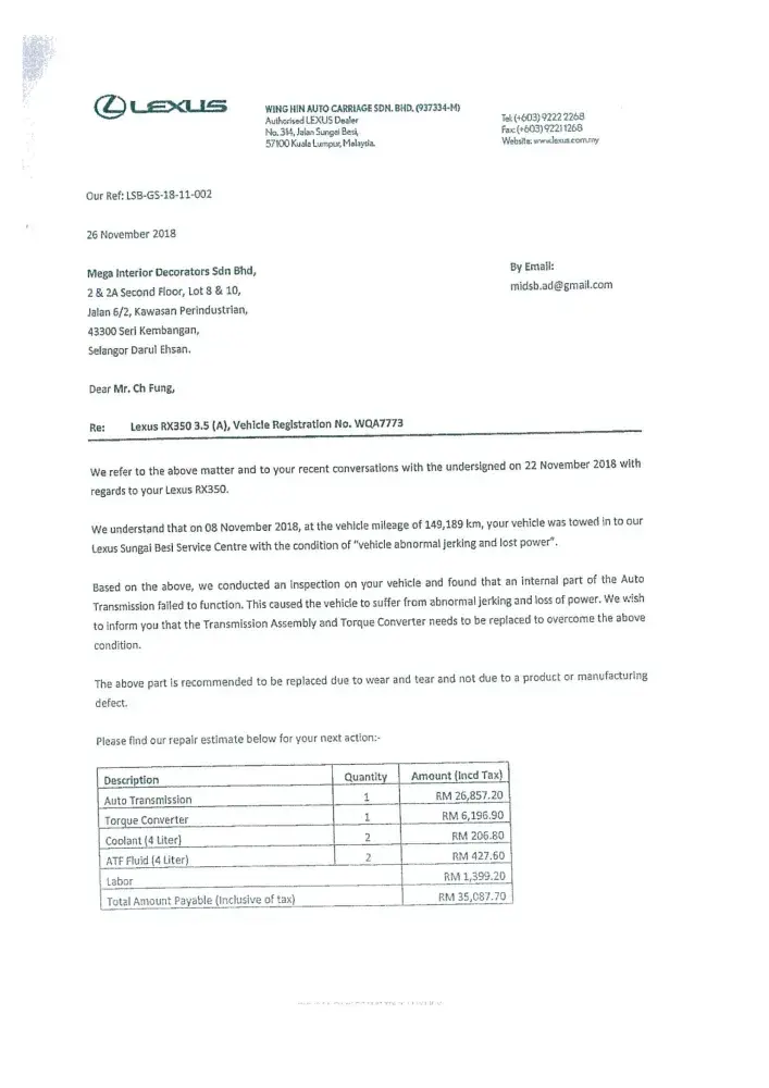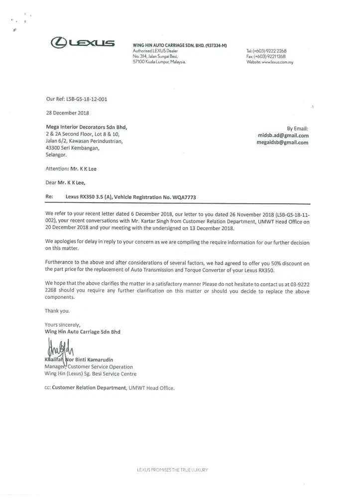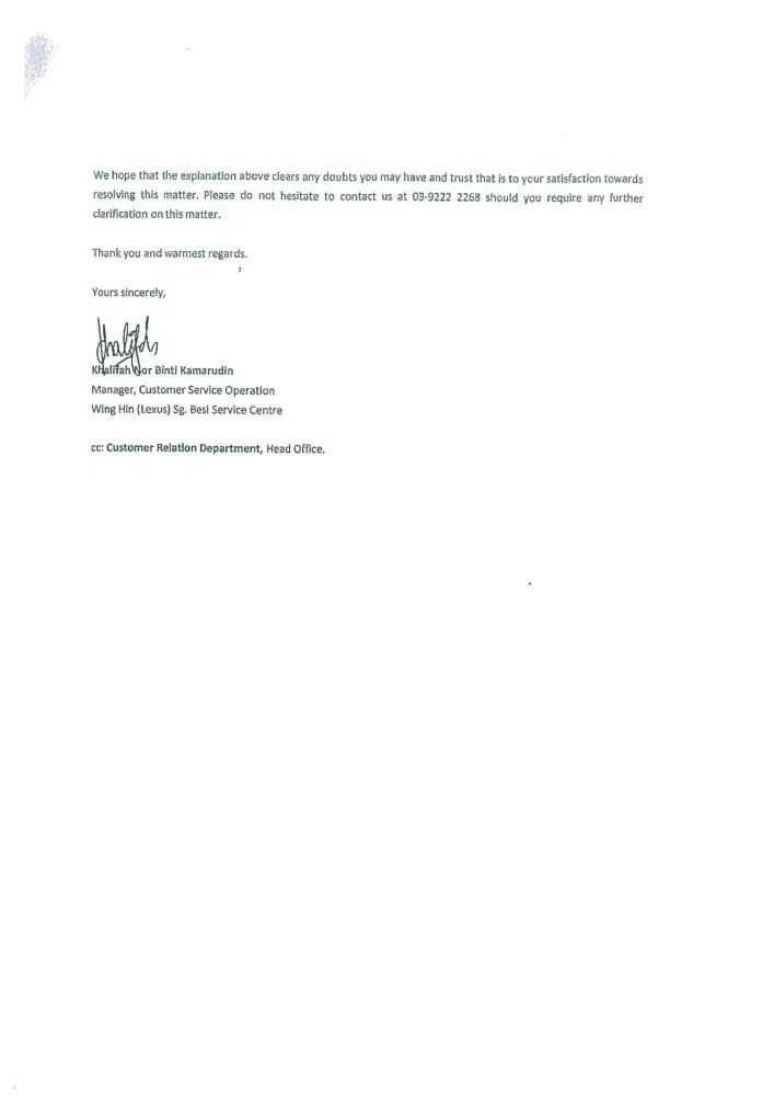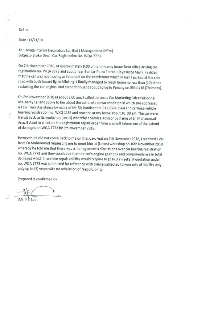 We are now totally lost confidence with your prestigious brand name LEXUS vehicle. Once again we sincerely wish our clarification and issued highlighted to your organization(Japan) with enclosed of our letters and your dealer's letter as stated below: