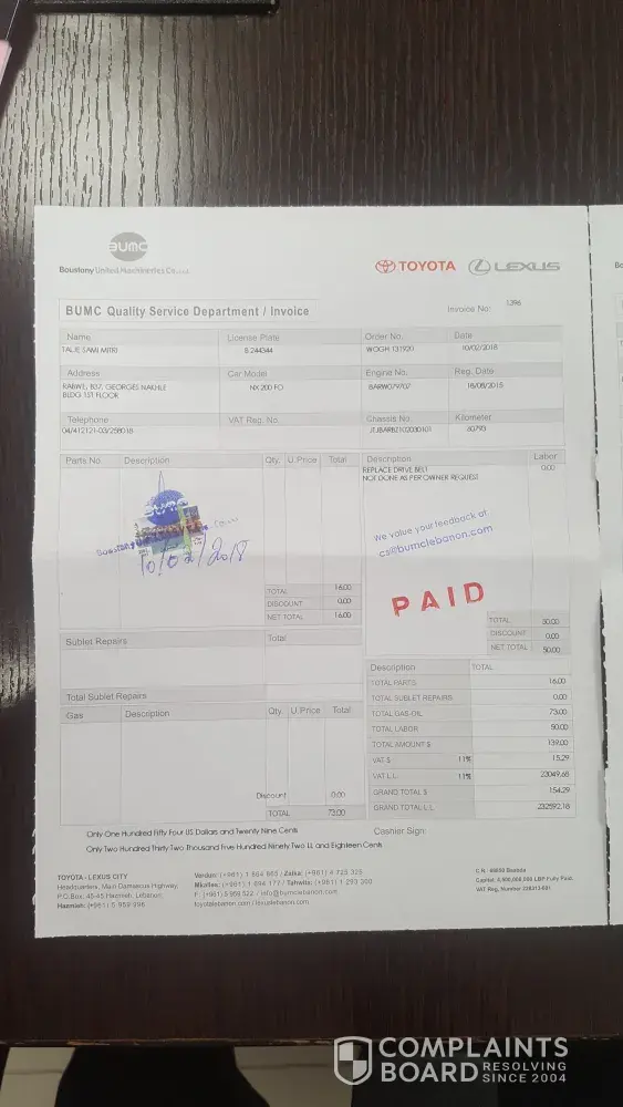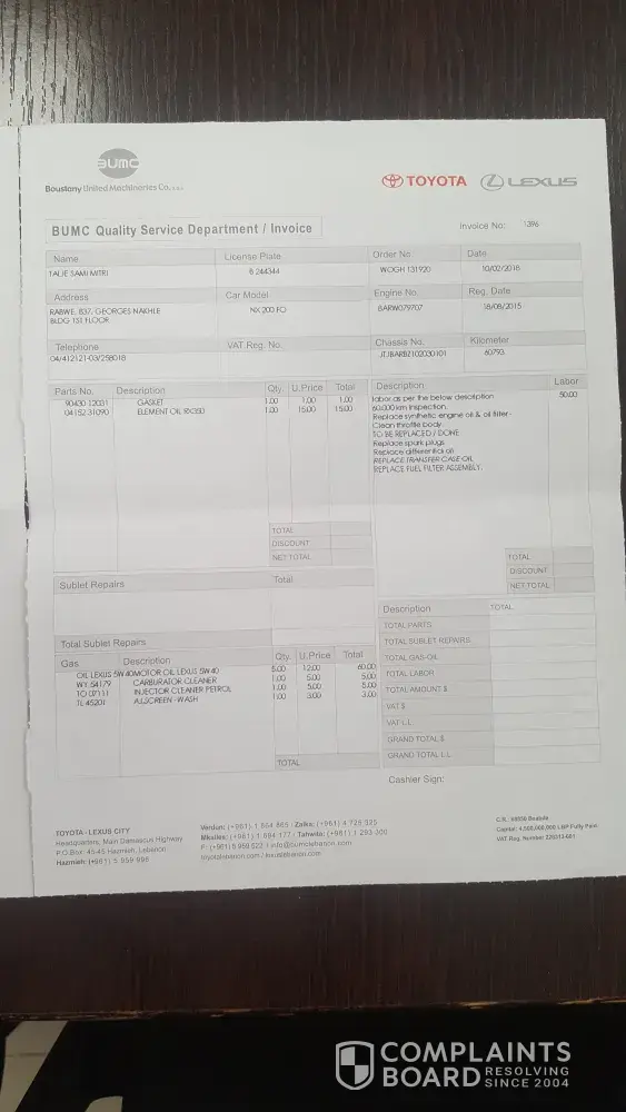 - on 10th of february 2018 I went to the head office for my 60000 km revision, even there I was badly surprised for the bad treatment I got, (I have an appointment) I had to wait 90 minutes only to have a list of what to do in my car, and as I was very late for my work so I did the minimum as to change the lube oil and to came back later for the other services, and to my surprise I have to pay for the checking 50$ for a service not done (they call it"checking"), how ever when they delivered to me my car, but without cancelling the alarm of oil change either the did not mention any note on the car maintenance book