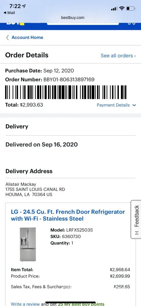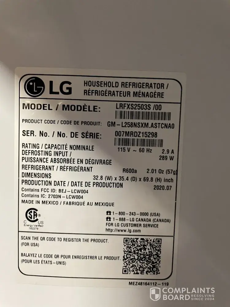 Model: LRFXS2503S from Best Buy. I paid $3000.00 and only got 13 months use out of it. Every appliance service company here in my hometown refuse to service LG (I understand why). Originally I wanted a simple repair, then replacement, now I'm seeking a refund due to delayed repairs.