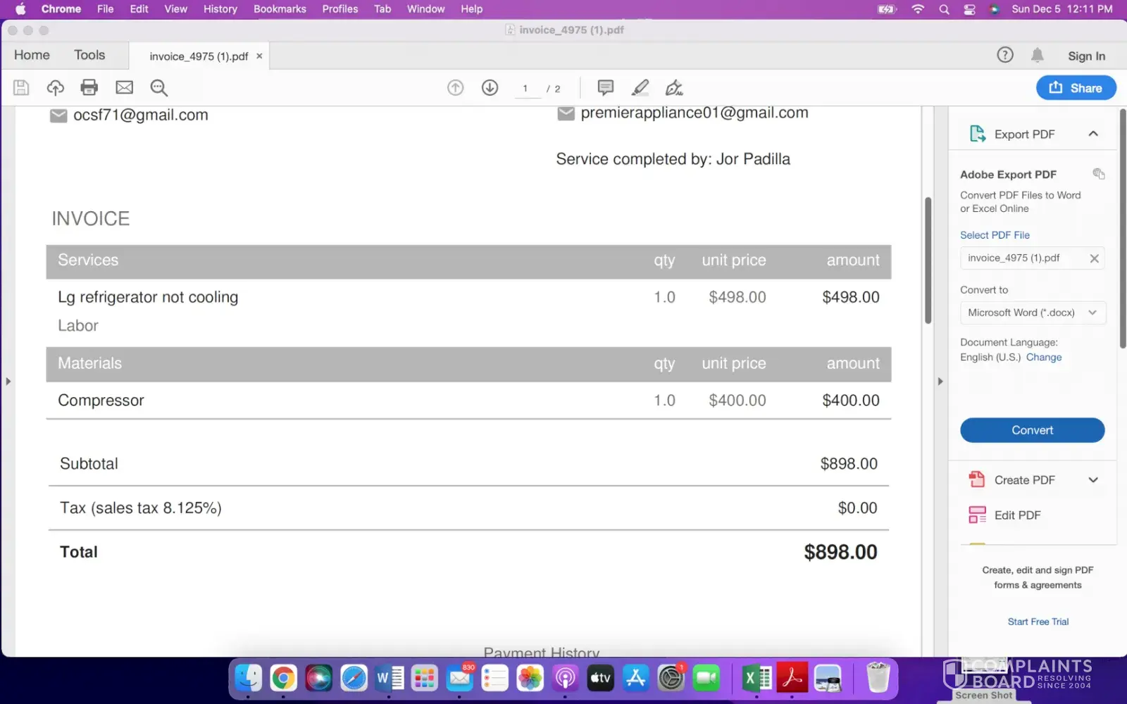 No refrigerator since September. Claim filed. No compression