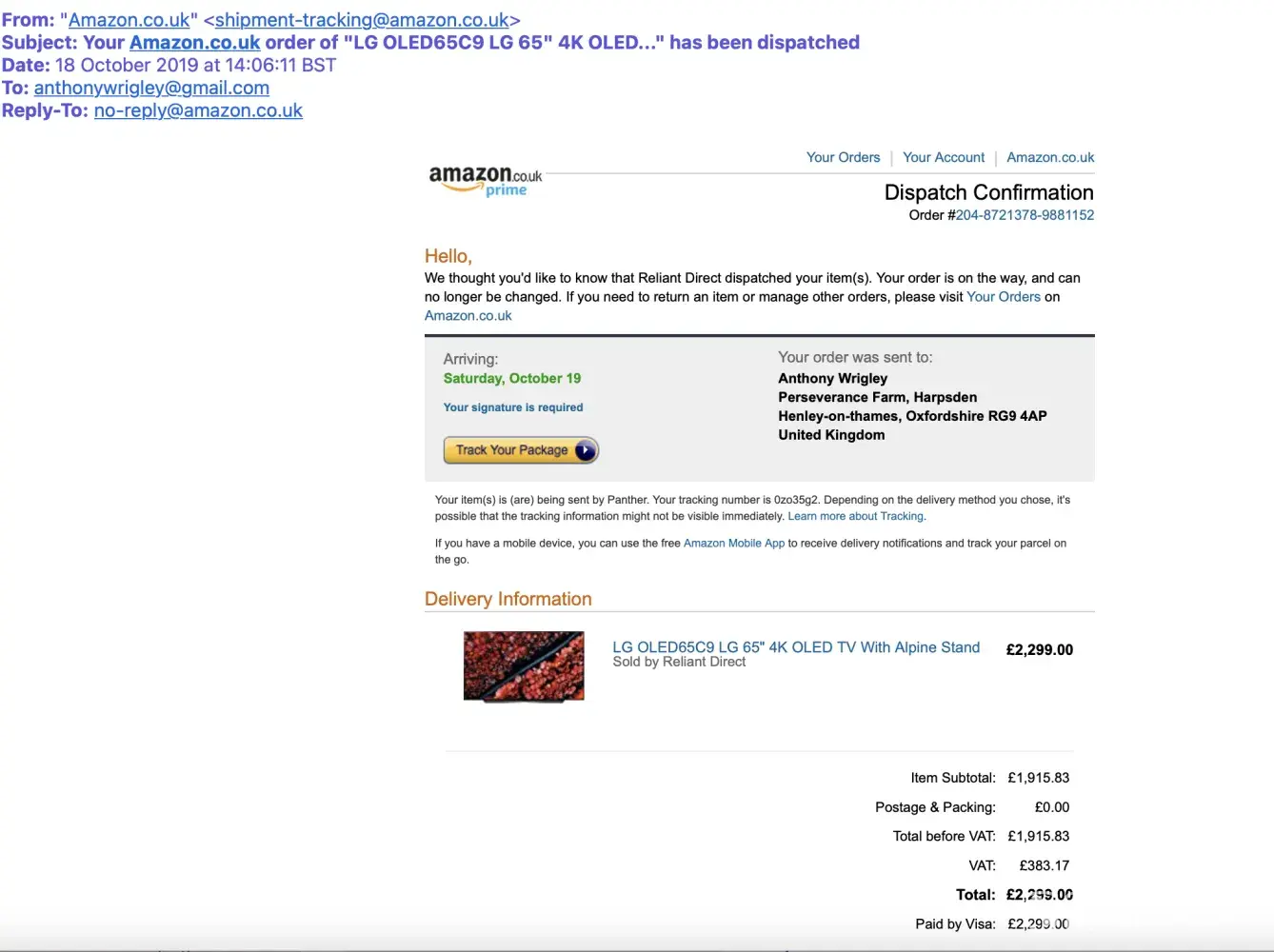 I purchased an LG OLED65C9 LG 65" 4K OLED TV for £2, 299 from on 17th October 2019 - 18 months ago via Amazon, Order #[protected]