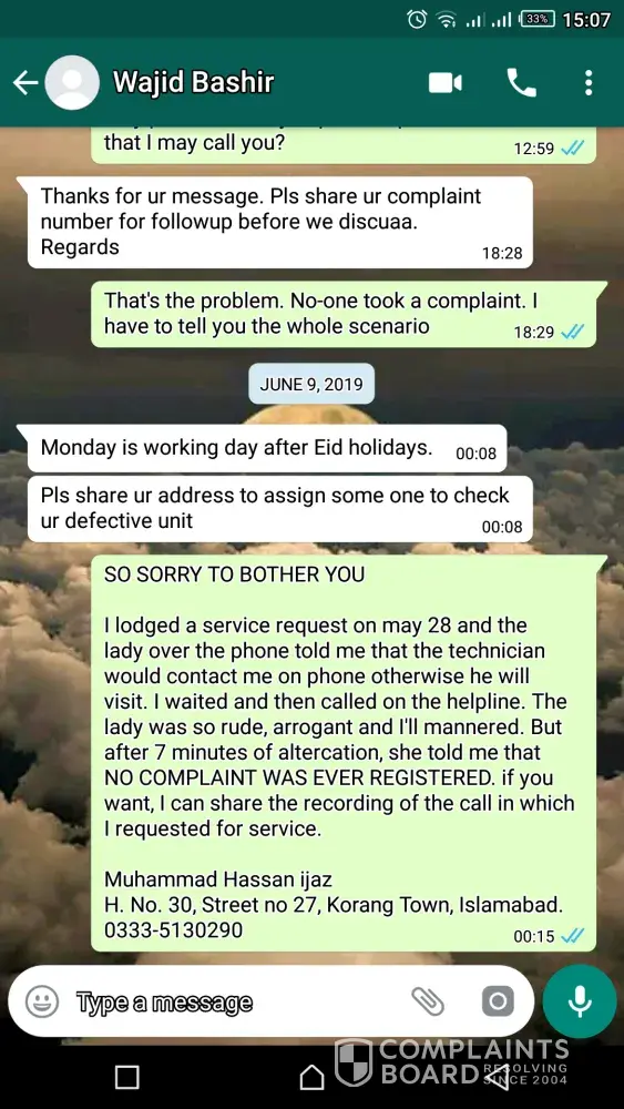 I am really fed up of services of LG in Pakistan. My washing machine has sensing error and I am complaining LG since May 28, 2019 but they are not even registering my complaint of service request. I even contacted country manager of Pakistan - Mr Wajid Bashir and he assured me that a reporter would visit me on Monday, June 10. But still nobody has even approached me. Can you please help me in this regard? I am from Islamabad, Pakistan. Screenshot is attached. My information is