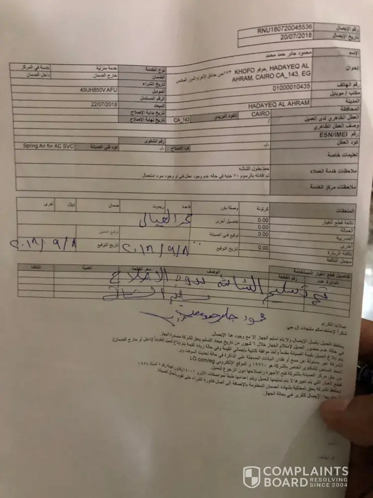 Reference to my email dated 12 September and telephonic conversation between the undersigned and LG service centre Lahore representative and his assurance that he noted down my complaint for immediate disposal. So far no action have been taken and undersigned have not received any intimation from LG service centre Lahore.