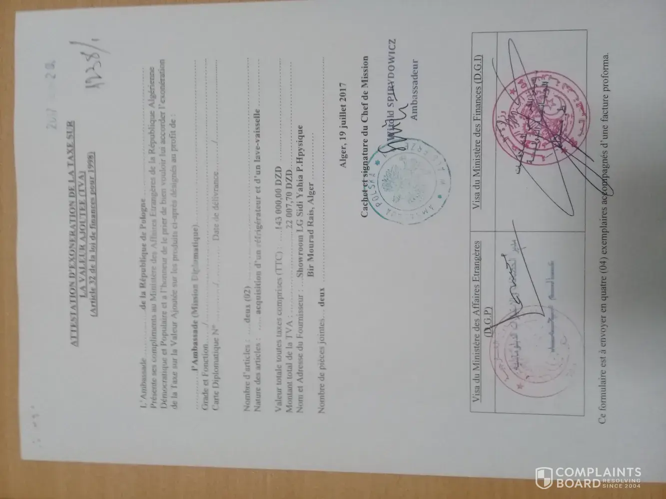 In 2017 we bought fridge and dishwasher and we paid gross price with VAT. Based on local law regulation embassies have right to not pay VAT, we received the necessary document from Ministry of Foreing Affaires which confirms our right to take VAT back. We have sent the file to your distributor in Alger, but he refused to pay us back VAT. We are trying now more that 1 year to speak with him, but nothing has changed. I asked your office for West Afric to help me - after their e-mail algerian office called me ocne again to say we do not care about your rights, we will not pay VAT back.