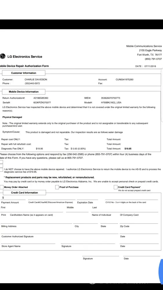 Looking at the reviews on the internet, it is obvious this is a standard response from LG repairs. I have to pay $20 to get my phone back for a second opinion or private repair!
