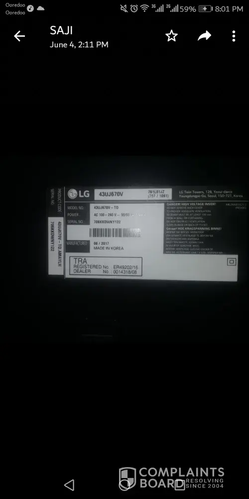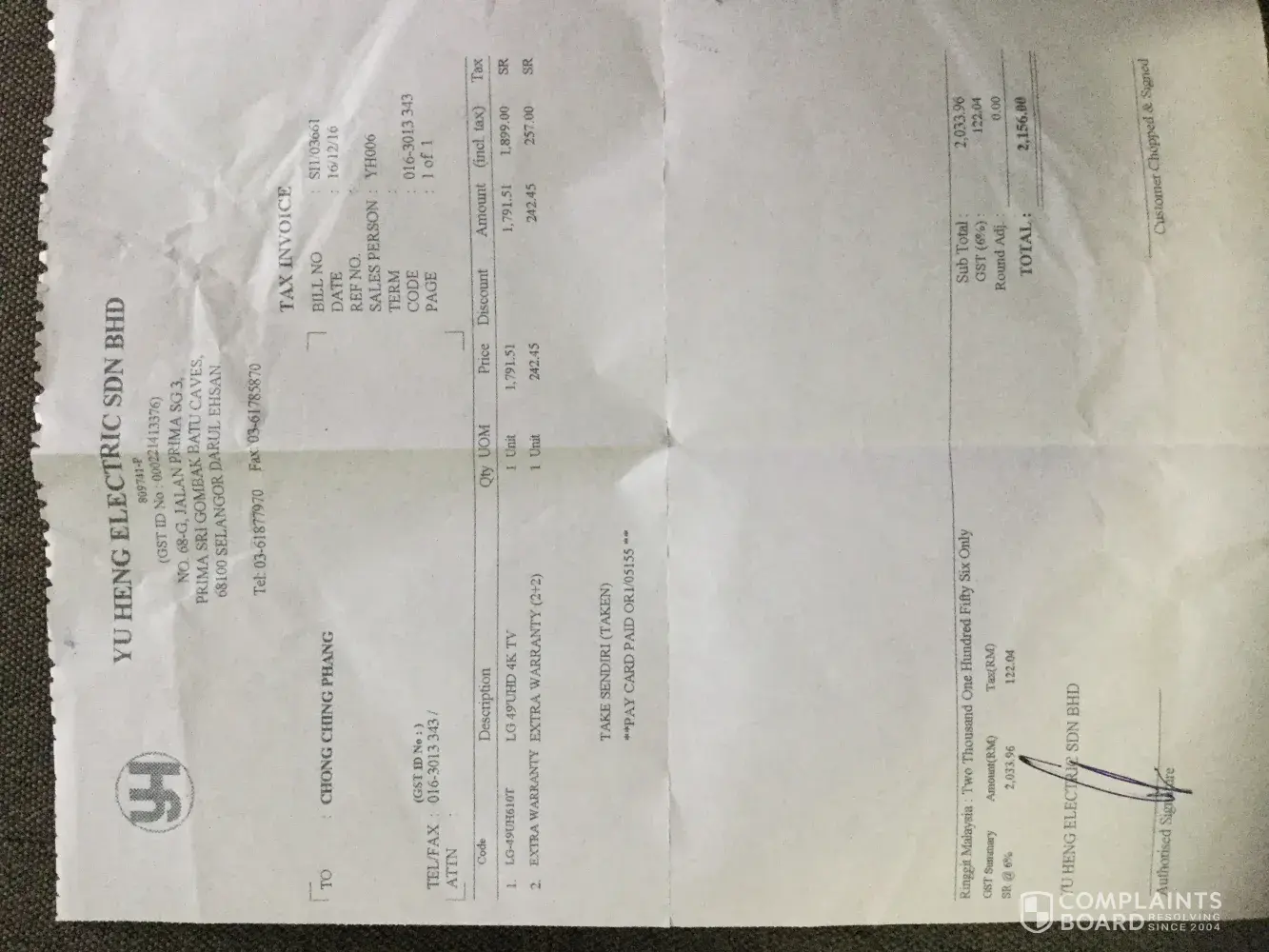 I purchased a smart tv on may 2nd 2018 and installed it on may 11th as I bought a table that fits it as proven by the Ikea purchase receipt. The smart tv broke on May18th and I contacted us agent in Egypt on their hotline 19960 which was hard to reach since they did not respond to their what's app number first place they sent a technician on May 20th that teared the TV apart in the living room on my couch and stated the screen needs to be changed since it went all black ...since then they didn't respond .