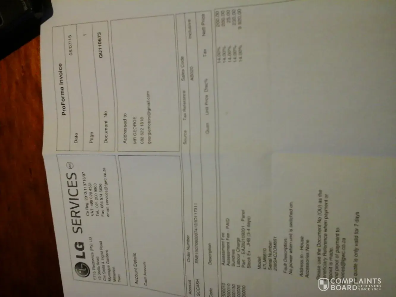 Dear Sir/Madam, On the 06/07/2015 I took my TV LG 47 inch LED to LG Service(ET 15 Electronics PTY Ltd) in Montague Gardens, 10 Stella Rd, Cape town .My TV is still working, but unfortunately from the Eskom Load Shedding, the TV have no picture, but sound for about 10 minutes, and then the picture comes on. And the TV works perfectly after this. I paid R.200 for quotation and I wait 4 Days for answer from them.Today I went fisically there to have answer for the quotation.I am sending you the attachment with the quot I have from them.Please can you respond to me to Whom I need to take my TV to be fix and according to the quotation I think that this is a Scam. I saw in there premisses they are selling second hand TVs and I presume are the TVs from the civil people who believe that there TVs are not wort the money to be fixed and they leave them there. Unfortunately I'm not one of them and I want assistance from You competitors to resolve this problem for not repairing my TV for the real service and price.My quotation from them is for new panel, that cost R.9200 excluding the labour, because they say is no power to the unit . I'm watching it at the moment . After I start the tv the picture starts in approximately 15 minutes, but we have sound. For me LG is good its just the services they provide are all not for the real price, as we expected. So the people who repairs the appliances must take a note from that. And we had to pay R.200 for there quotation. And I'm sure it is something small, because after it gets warm up it's working perfectly. Please find the attached quot from them.