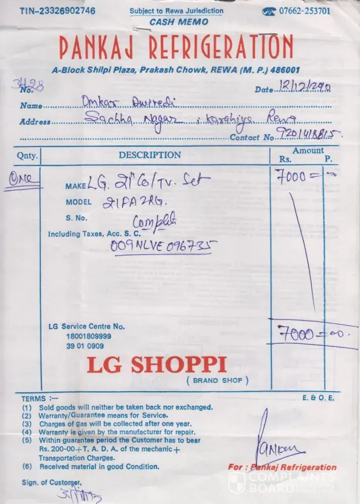 I purchased a new LG 221"colour TV set Model No. is 21FA2RG S.No. is 009NLVE096735 from "PANKAJ REFRIGERATION A-BLOCK SHILPI PLAZA, PRAKASH CHOWK, REWA (M.P.) Dated-12/12/2010 . In the last 12 months the TV has been rectified 7 times and the validity is going to expire in tne next 15 days time and it has again gone out of order. As my TV is giving repeated problems it is requested to change my tv set.