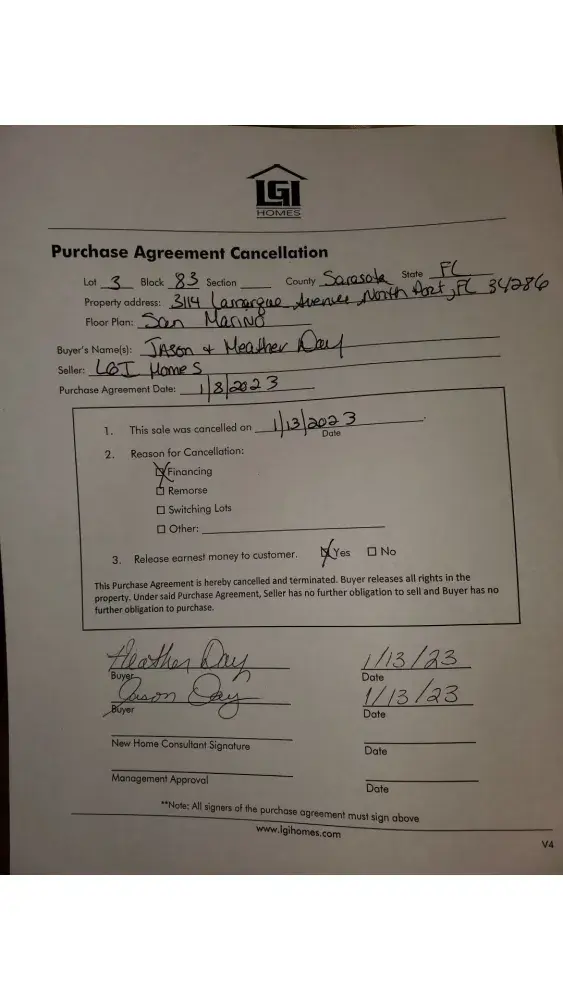 Have filed complaint with BBB and will proceed further if we do not receive our funds asap.. RED FLAGS regarding LGI. This is not an honest company. They take your photo with a Sold sign to then say your not approved and need to do x,y,z after guaranteeing they will get you into a home. On top of that they will take your $1000 deposit, from a legally disabled individual and cash it. To then tell them every excuse in the book why your money is delayed being refunded to you after the allotted 10 business days. Well this simply is not acceptable. I waited the amount of time plus another 7 days and given the same excuse and am now told to wait until Sunday (another week) I will not be put off. I want my deposit rightly refunded back to me and if it is not produced within the next 48 hrs we are seeking legal action. I caution all prospective home buyers to not get baited like we did. Completely unethical.. very disappointing on a business operation level. LGI, do not promise to be what you are not as a company and then jerk people around when you owe them. Your own legal documents promised our funds back by a specific date. You then produced documents stating we would have our funds in hand no later than January 30th and have now lied to us AGAIN, trying to put us off 7 more days to Sunday which is a day no one is available! Overnight it, wire it, we don't care. Just refund OUR money to us.