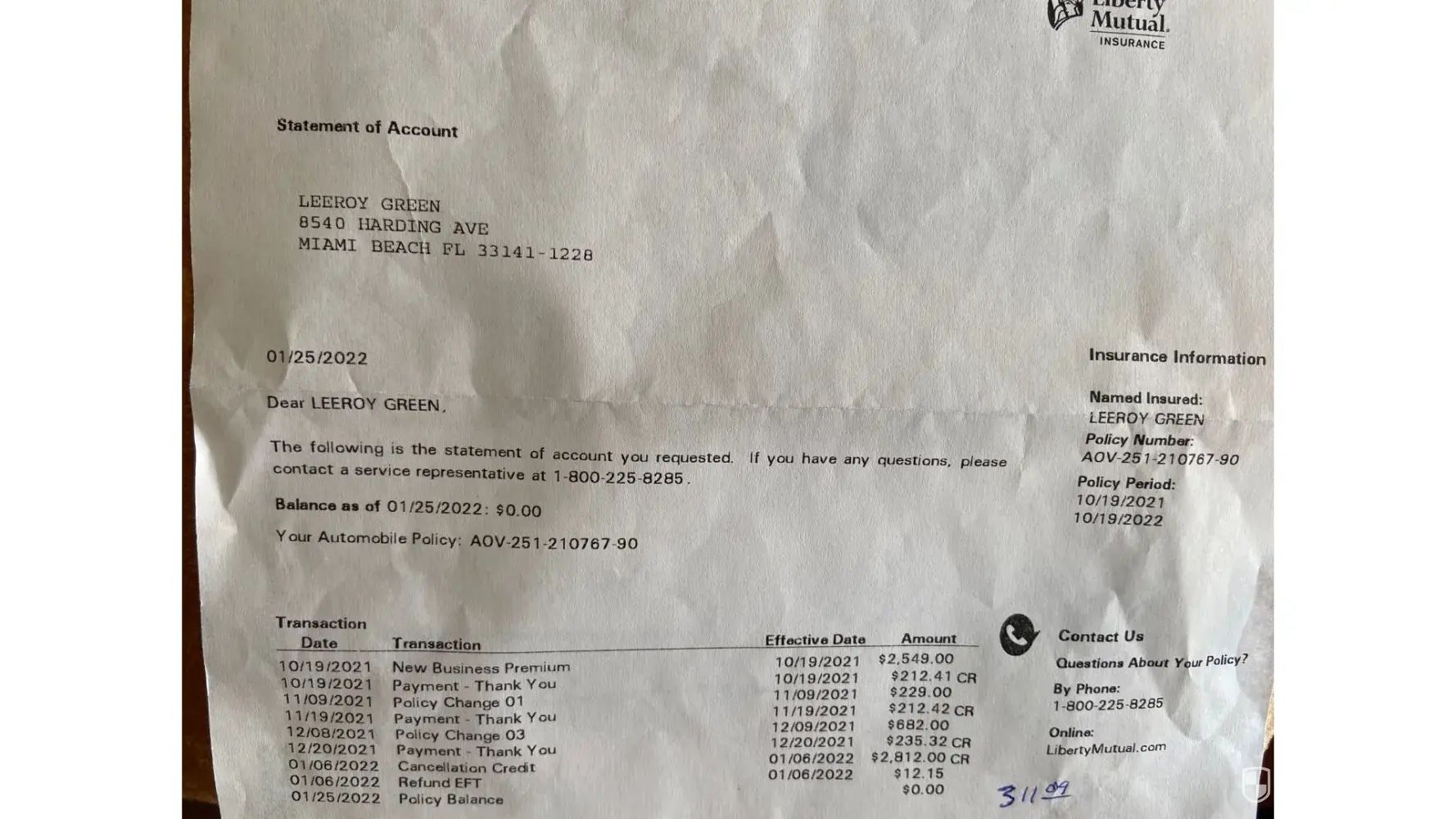 On December 20, 2021, I paid Liberty Mutual Insurance $235.32 per month. On January 06, 2022, I cancelled the auto insurance. there was 14 days remaining until 1/20/22. I was refunded $12.15. I am filing this complaint to get my full refund for the days I was not a customer. Policy number: AOV-[protected]. Please see attach file that show my payment. Thank you Leeroy Green