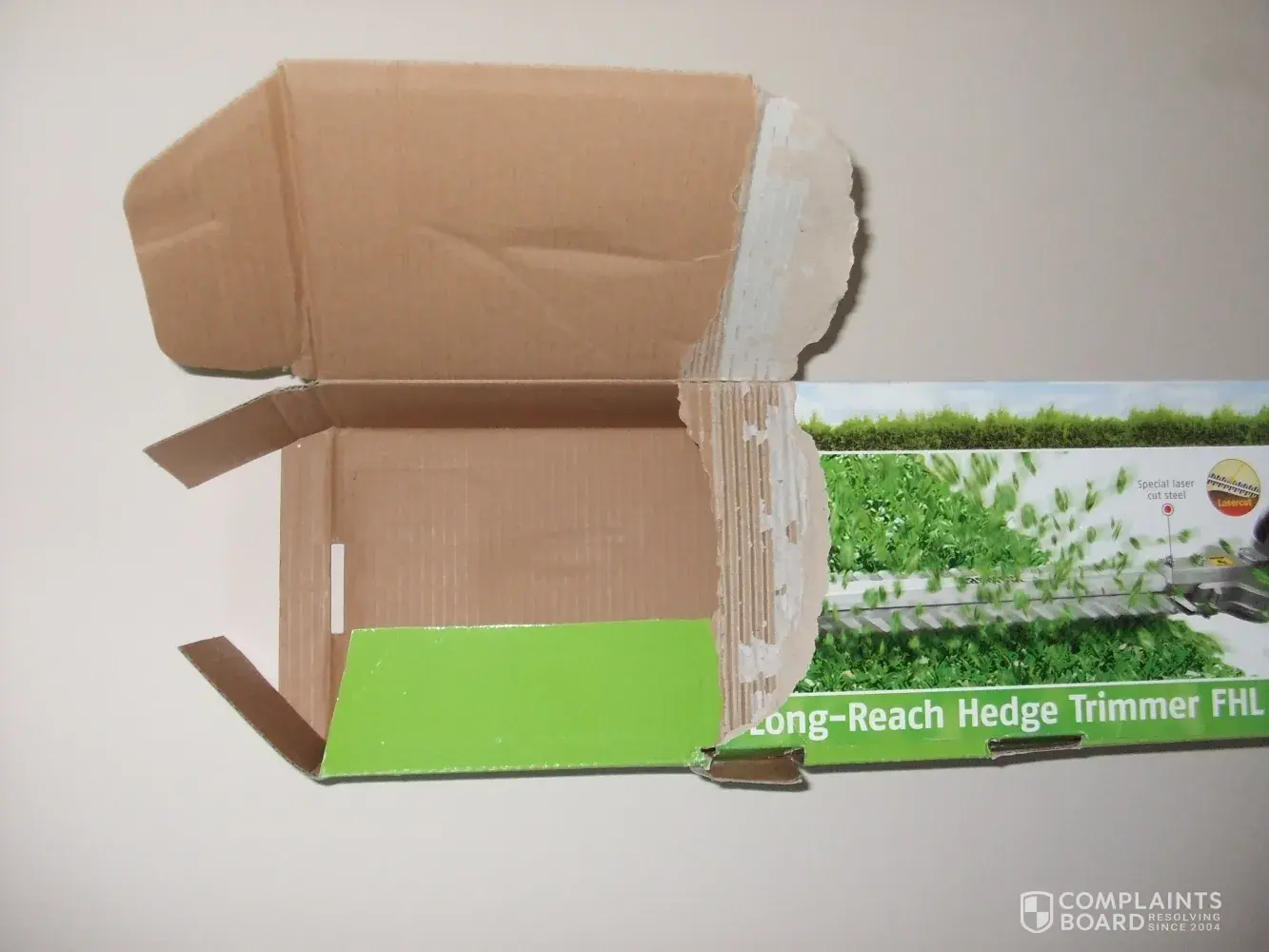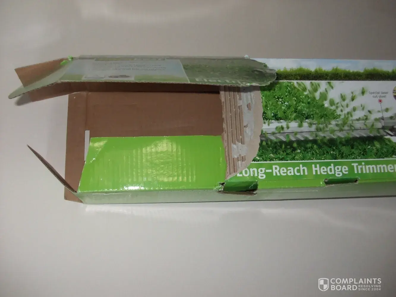 Visited Lidl's Port Talbot store to purchase a long reach hedge trimmer. Found only one was left on display, which had been opened, parts removed and put back incorrectly, and the packing box was torn right across the top.