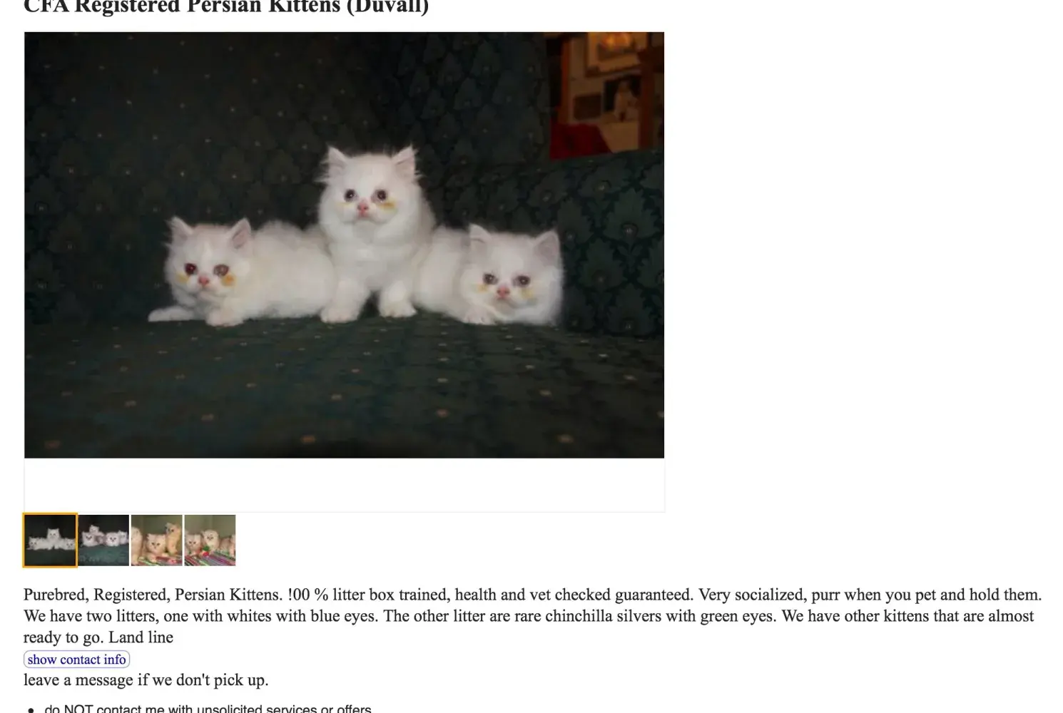 Now I see more adds from the same person. Please do not support this establishment. Feeling sorry for the kittens and buying them will only enables her to create more babies that will need to be rescued.