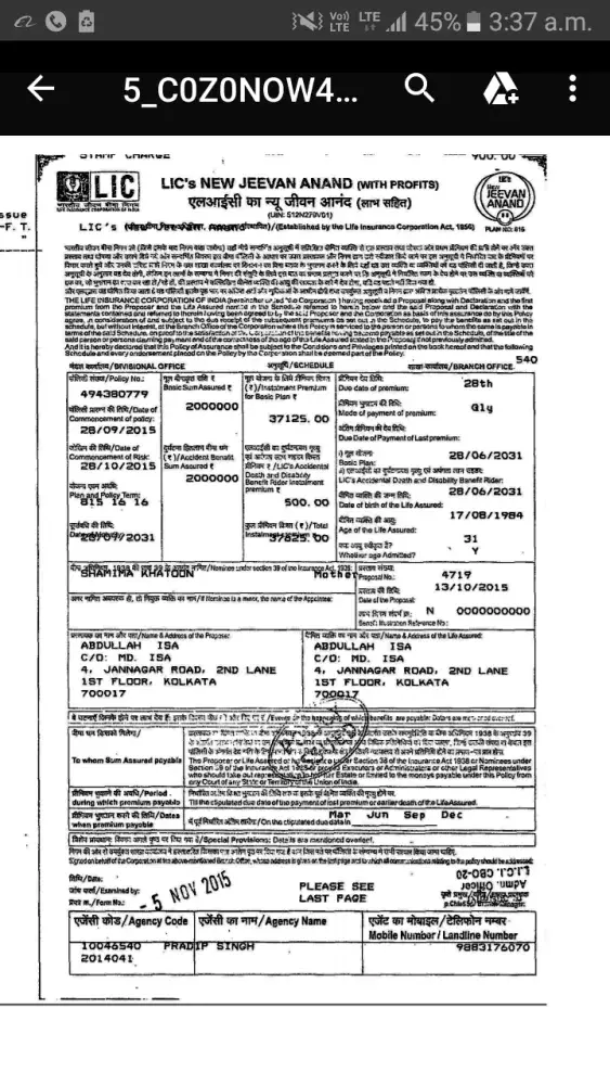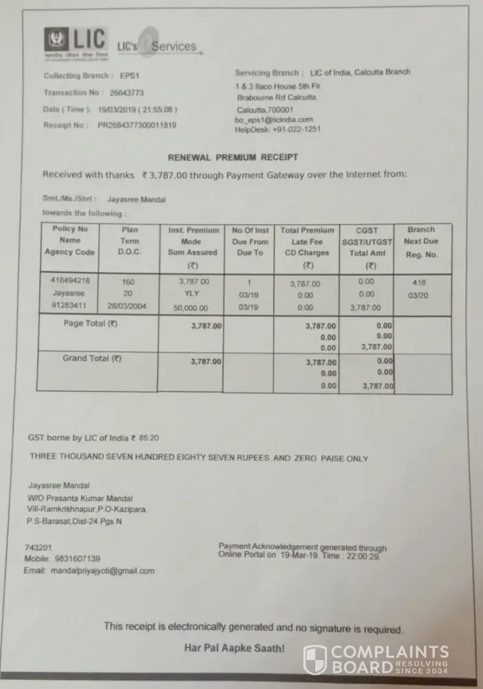 I am jayasree mandal my lic policy number is [protected] date of commencement of policy is 28/03/2004 the premium is rs. 3787 yearly.