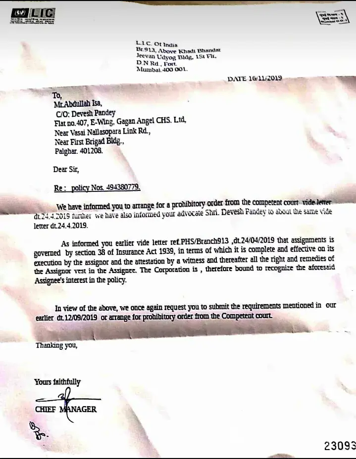 My name is Abdullah Isa, and I am basically from Kolkata and working in Mumbai. I had some financial issues for which I took small loan from a private money lender in Mumbai who took my LIC Policy (Policy number [protected]) original Bond as mortgage and asked for 24 blank cheques signed as a security for loan. He asked me to sign on his company's letter head where it was mentioned that I should pay him 4% of the loan amount every month as interest and when I will fail to pay him, he will apply for loan from LIC against my policy (Policy number [protected]) on my name.