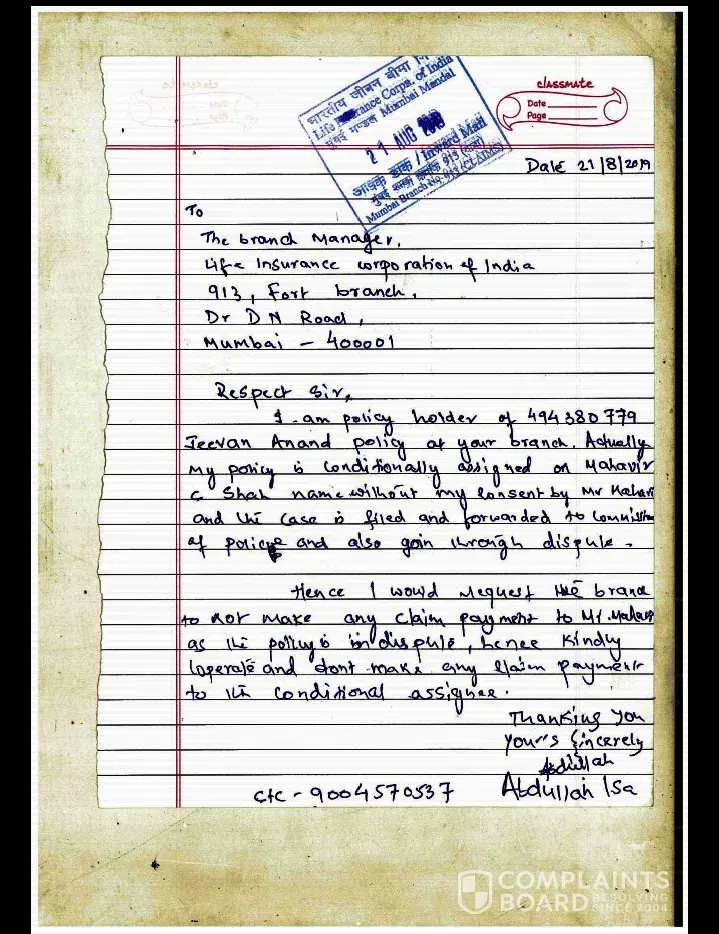 My name is Abdullah Isa and I am basically from Kolkata and working in Mumbai. I had some financial issues for which I took small loan from a private money lender in Mumbai who took my LIC Policy (Policy number [protected]) original Bond as mortgage and asked for 24 blank cheques signed as a security for loan. He asked me to sign on his company's letter head where it was mentioned that I should pay him 4% of the loan amount every month as interest and when I will fail to pay him he will apply for loan from LIC against my policy (Policy number [protected]) on my name.