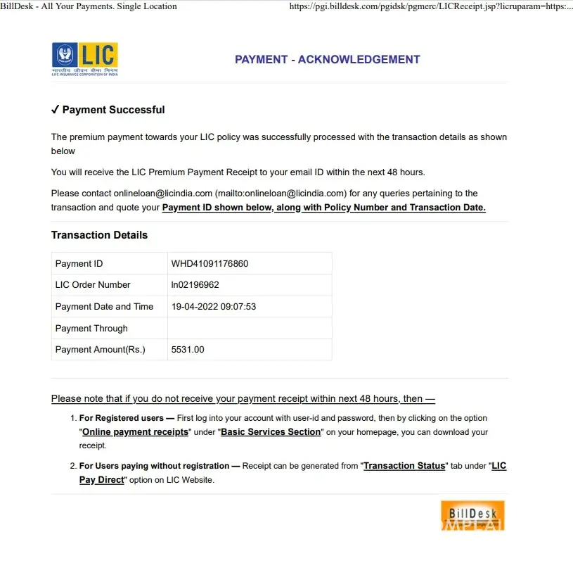 i paid my LIC online at 31/03/2011 and my account has been deducted by the premium amount but reciept not generated by the LIC india i made a mail to LIC and so much comlain to lIC india but they are not responding my policy no [protected]