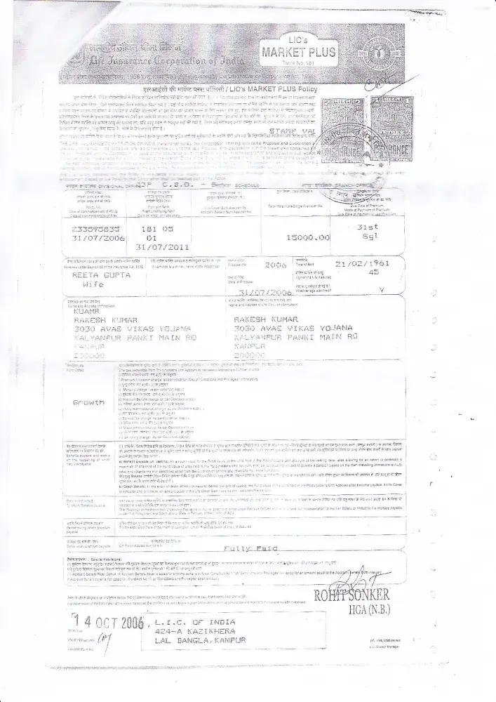 plan 173 and paid an amount of Rs 20, 000.A policy was also issued by the LIC in my name