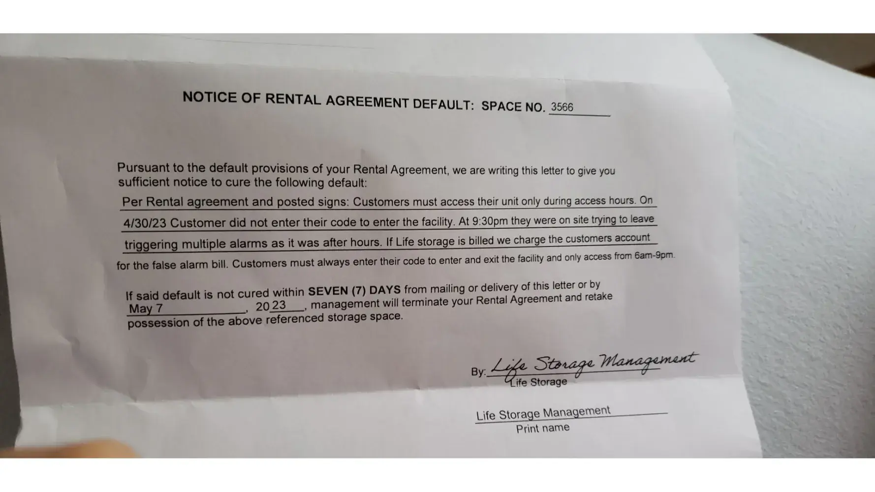On April 1st at 7:30pm we came back to drop off things to our unit, there was an envelope with a letter from the store manager stating that on April 30th me and my husband accessed the storage property without the gate code then tried to leave the facility to get out triggering multiple alarms! What? Moreover manager stated we could be charged by their security company for triggering alarm afterhours. And if we don't resolve this matter our unit agreement will be terminated.