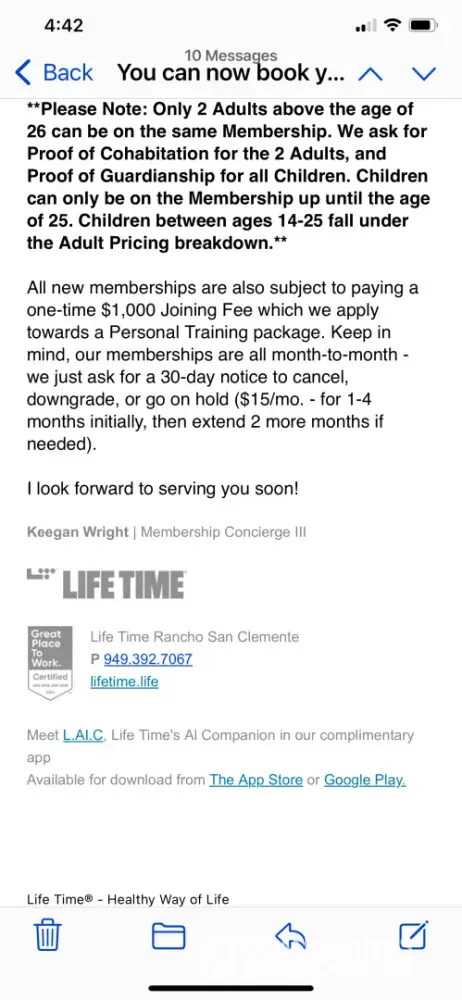We found clear and detailed contact information for Life Time Fitness. The company provides a physical address, 2 phone numbers, and 2 emails, as well as 4 social media accounts. This demonstrates a commitment to customer service and transparency, which is a positive sign for building trust with customers.