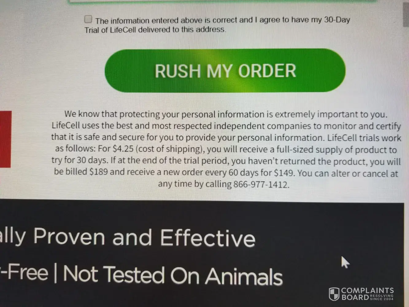 THIS IS A TOTAL SCAM. They advertised on Apple News targeting men about their “free trial”. Then when I text chatted with them on their “Free Trial” link, I was told that if I kept the product after 30 days, my card would be charged $189. Whoever I spoke with said that AND their posted “Guarantee” says: " If you keep LifeCell beyond the 30 days “free trial period”, your original form of payment will be billed $189." After that the payments would be $149.00. HOW is there any free trial period when the first payment is even more than the following payments? They said I would also be charged $20 for shipping overnight with delivery on Saturday (and that this was a 50% discount). The cost for overnight is $99.94 so you know it would be sent ground (3-5 days) which is $10.96. I didn't trust this trial period billing promise and purposely used a credit card that I recently maxed out leaving $50.00 available credit. Sure enough, they just tried to charge my card the full $189 before I even started or received their product. THIS IS A TOTAL SCAM