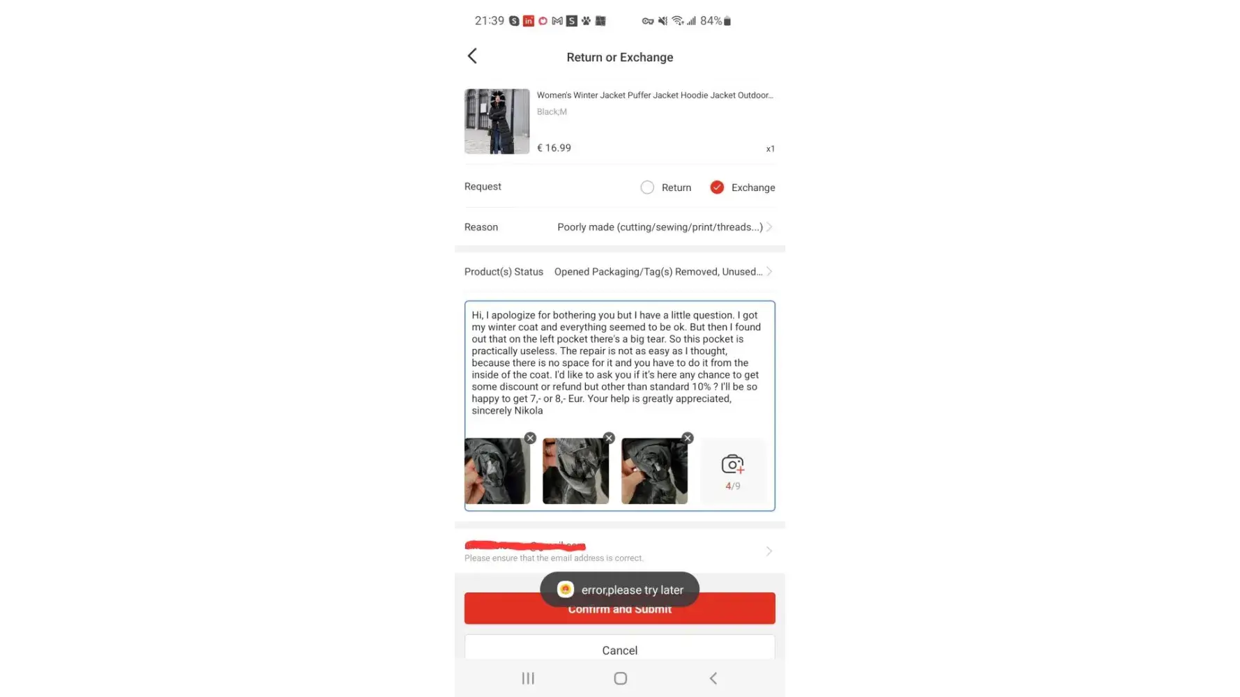 I bought a winter coat from this website. First of all delivery took forewer, but I was patient and understanding. When I finally received it I found out that one of the pocket has a big tear. Because the tear is inside of the pocket it's practically impossible to fix it, so I can't use this pocket. I tried to contact a costumer service maybe 50 times. Unsuccessful. You have just 7 days for returning or exchanging, but every try ends with the notification "error, try later". The worst part is the fact there's no other way to contact a customer service except through the form you have to fill. But you have no chance to fill and submit it 😕 So you are stuck and there's nothing you can do.