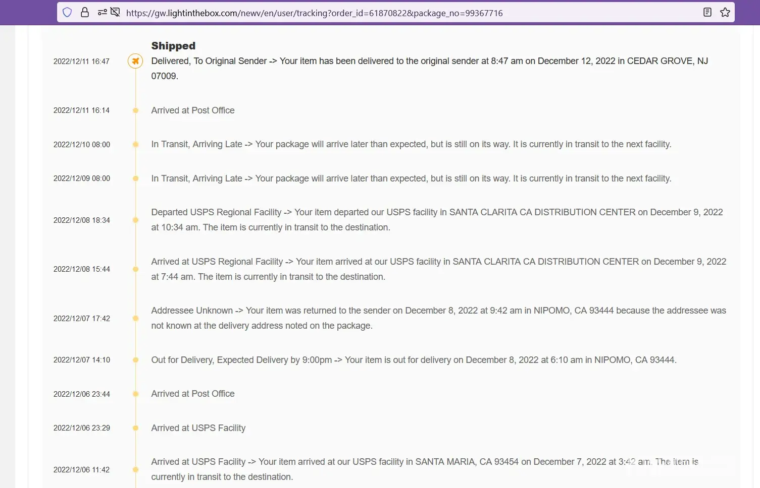 So I was ordering a pair of cosplay raccoon ears and tail for my partner for Christmas and was having it sent to a friends house since I don't trust my family around my mail but it was returned to sender due to some complications and so I tried to get it redelivered with the tracking number on the USPS website but it never worked so the package was sent back to the sender and I was never refunded because I'm not sure if I will ever get the package after it was sent to the sender. This happened on December 8th 2022 9:42 AM