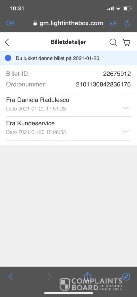 I have ordered 2 rain jackets and 1 pear of shorts from LightInTheBox company online, on the internet from 14-15 the of January and have no products or answer until now from them, I have spent 642 danish kroner which I can't prove! I just want my money back! 😡 It is frustrating because I got this shopping site from Google and I thought that is a secure place to buy, it's actually unbelievable because every time when I've tried to track my stuff they are closing the page, I can not contact them at all! So I hope I can get some help after this message! At least LightInTheBox to write me and say what is wrong! Underneath I have attached some pictures with my order!