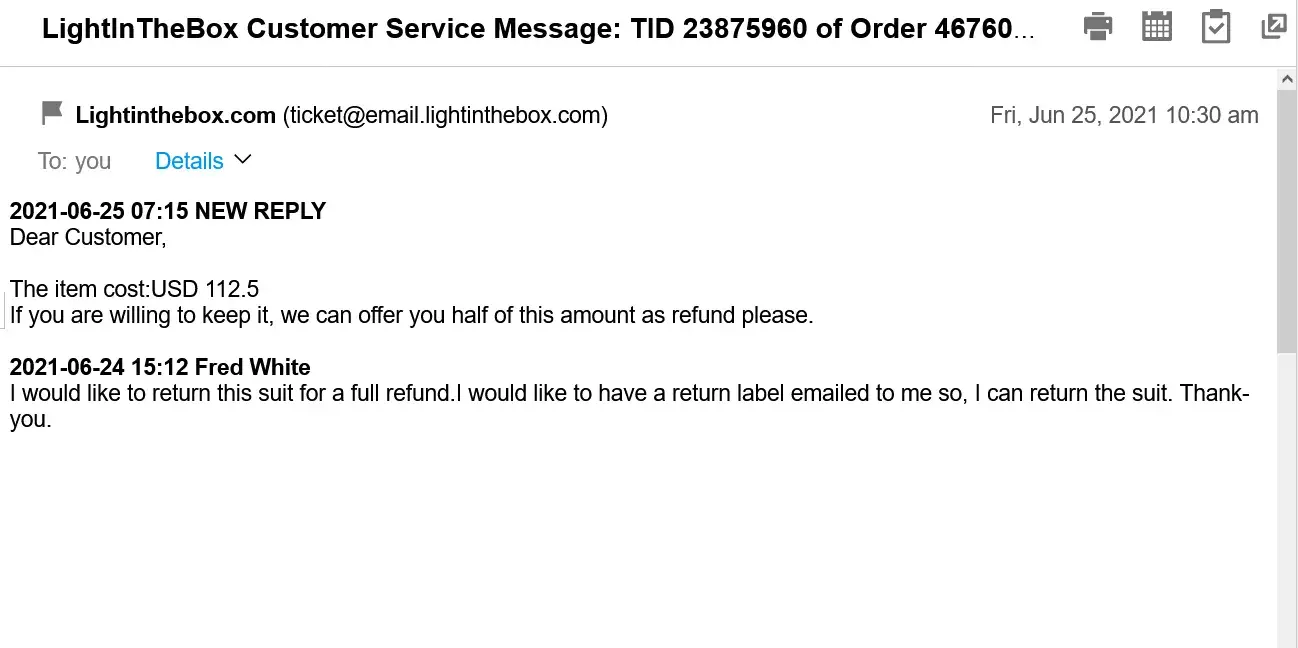 I bought a suit from Lightinthebox.com that was$125.80 on June 8th, of this year. I was under the impression the suit would be delivered in a week, I need it for a wedding on June 17th. The suit was delivered on June 23rd, it was too late. I emailed the company for a refund on June 24th, and they said they would give me $11.00 back and $22.00 in their rewards. I then emailed them again and told them I needed a full refund, they then said to keep the suit and we'll give you half of what I you paid. All I want is the $112.00 which is the full refund, before shipping. My email is [protected]@verizon.net