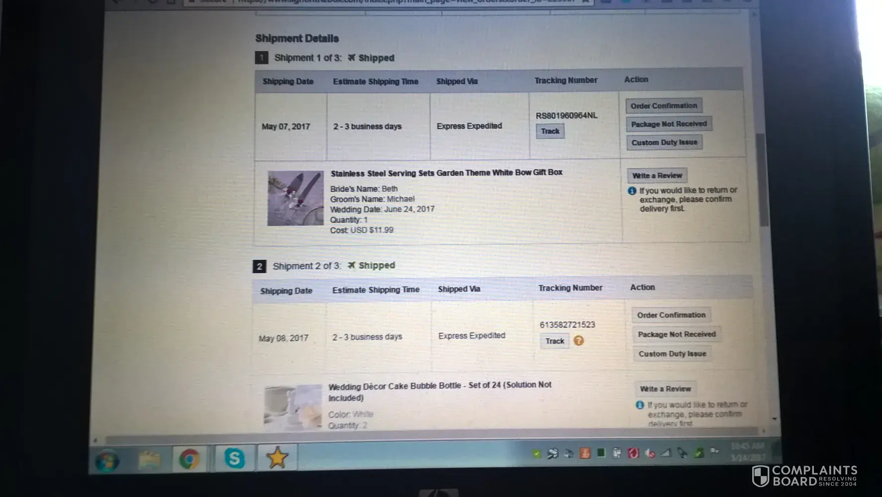 I ordered 4 items from Light in the Box. They are all in one order. First, one was shipped according to them. Then two more shipped according to them. Now they are telling me that all three of those items have been delivered, but I received nothing. The forth item, my wedding dress, has not shipped yet. The don't give a phone number for me to call customer service. I need all four items for my wedding. At this point I have begun looking for another dress and other needed wedding items. I just want to receive my entire order in time for the wedding, or a full refund including shipping since nothing was shipped.