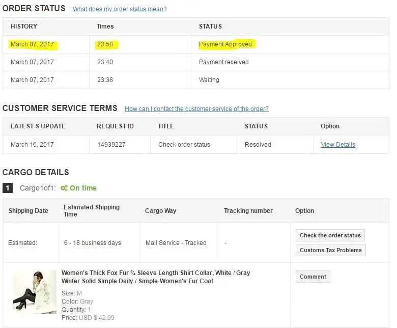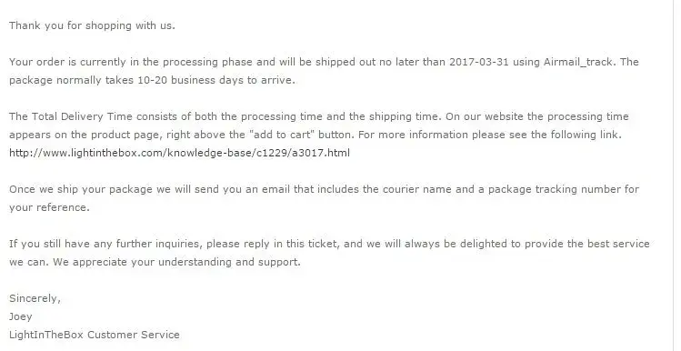 On 07.03.2017 I ordered a product with a processing time of 1-4 working days. They do not deliver cargo!