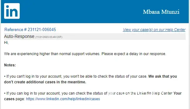 Allen K Reference # *** View your case(s) on our Help Center Auto-Response (09/25/2020 07:41 CST) ? This is a support email in response to your request submitted on LinkedIn?. LinkedIn Corporation, 1000 West Maude Avenue, Sunnyvale, CA ***... LinkedIn and the LinkedIn logo are registered trademarks of LinkedIn...
