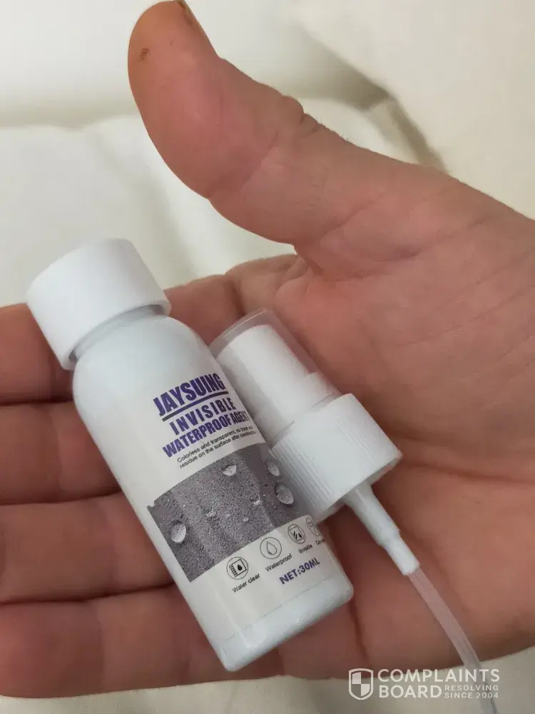 What I saw on the video and what I received had nothing to do with each other. Instead of a 300 ml bottle it was a 30 ml one. And instead of being a product called powerful sailant spray time by name jaysuing invisible waterproof agent.