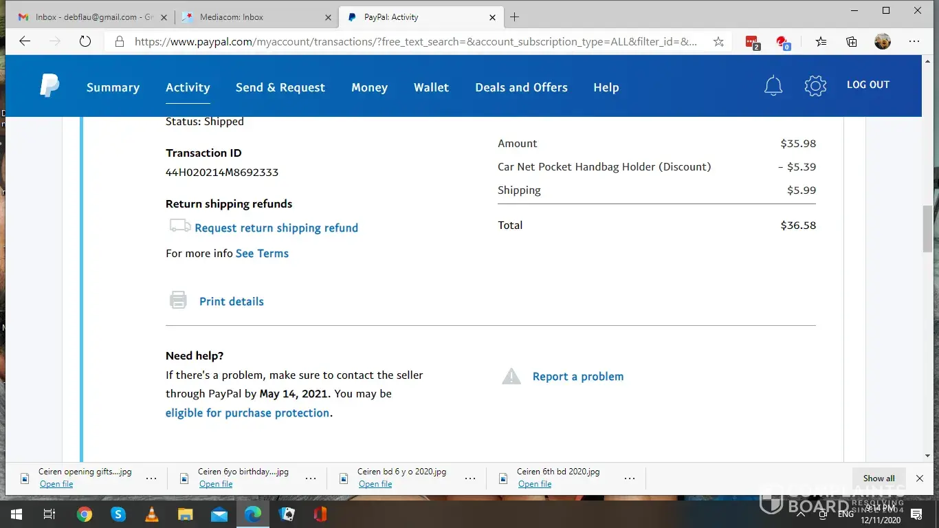 I will attach screen shots of the email sent to me confirming the order and confirming shipment...4 screenshots. Further codes and info are on the screenshots.