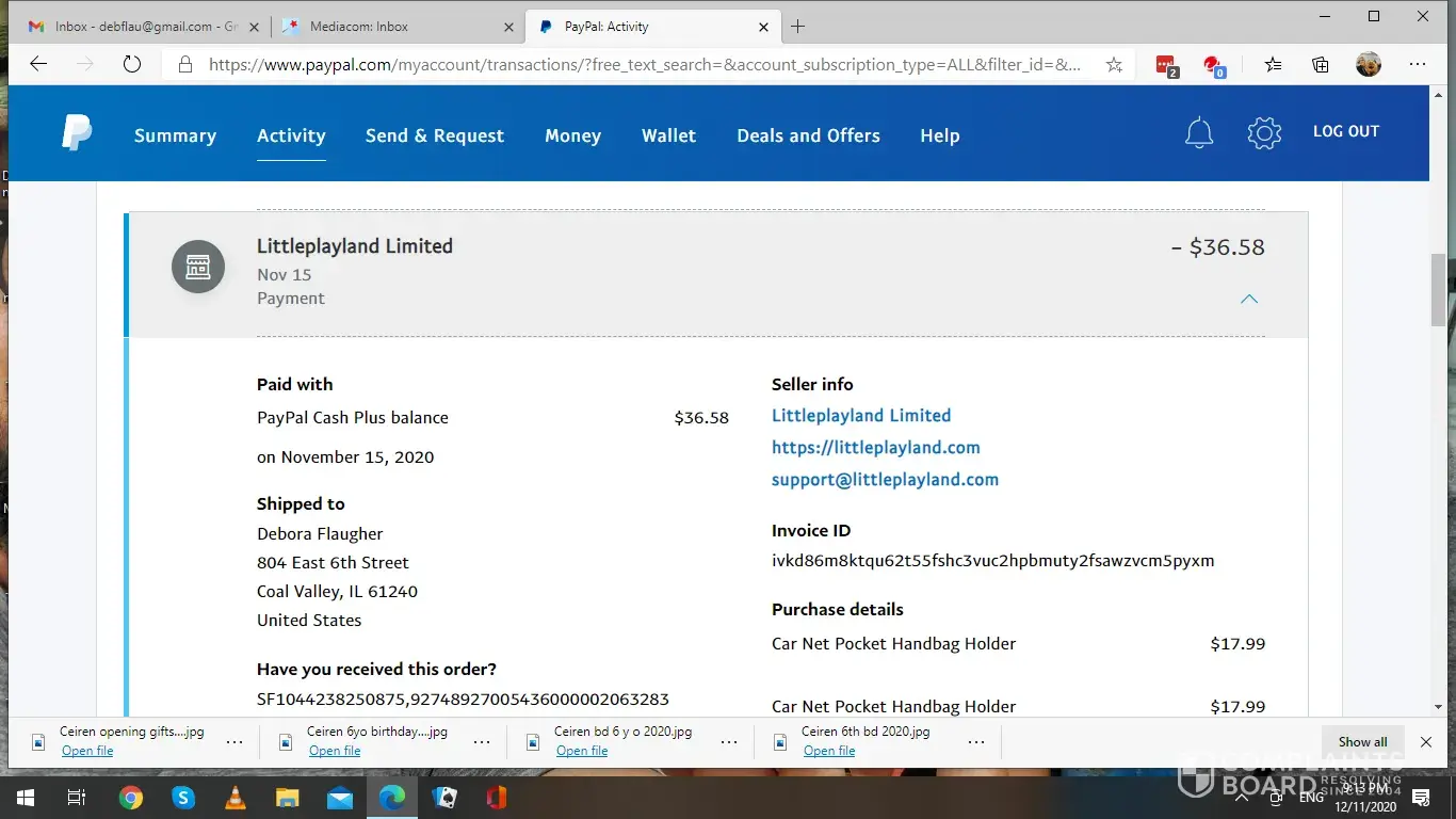 The item has not arrived, the USPS shipping number does not exist, the customer service email does not exist and there is no phone number to call for customer service. Little Playland is who has the account with Paypal, but the company I ordered from is called ykcengine. My order number is YKE45803 and the two items I ordered totaled $41.97. The order was placed on November 14, 2020.