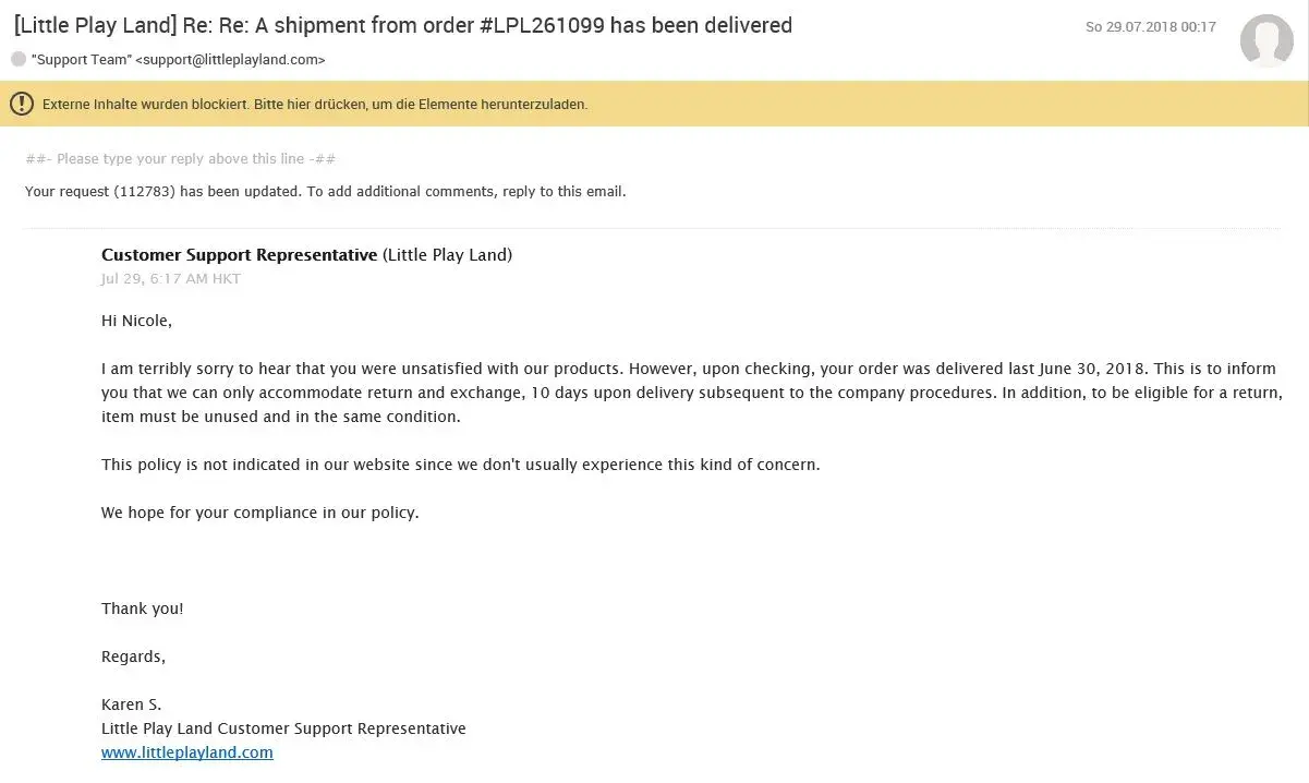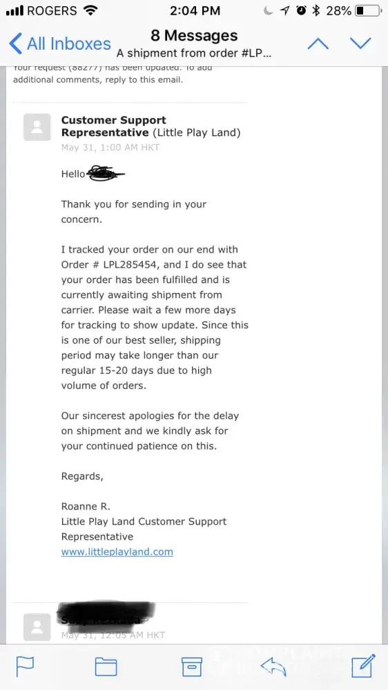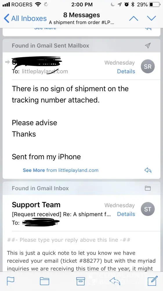 Little playland are scammers, I have managed to get a refund for one parcel but the second one they refuse to pay me back, for me to actually get it I had to send more that 5 emails per day. I went as far as lodging a dispute via my financial institution, the most frustrating thing is that you deal with 100 different customer consultants and they don't check the history of the case before responding. It's like all of them are working for a different company. I am so sick of them, but I won't rest until I get my other refund. How can you order on the 29th of November 2020 and still they will tell you that the parcel has not arrived till today and they have a nerve to tell you to be patient. They are total scammers, I don't have $153, 85 to donate to little playland!