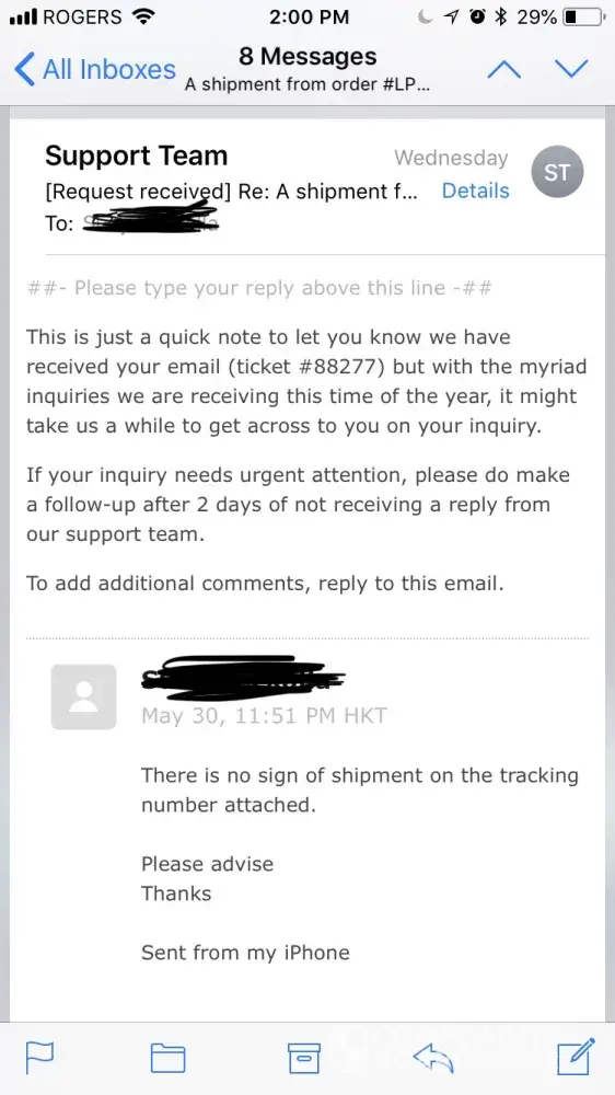 I purchased a product from them on 6th May, it is now 30th May, I have written to them on countless occasions and they have provided me with a 'tracking number' (LZ335110248CN). Told me to be patient. Would not respond when I asked who their carrier was.