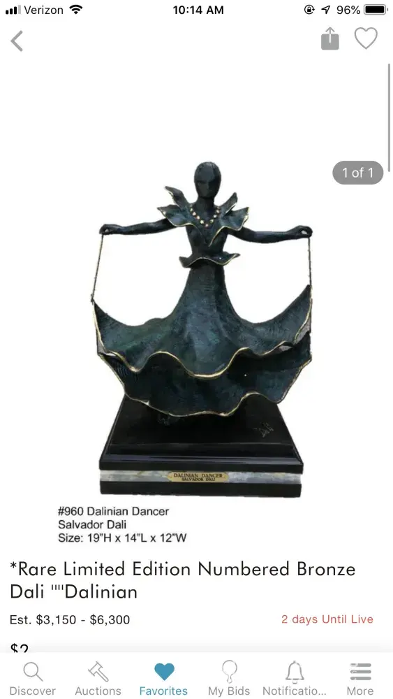 Purchased "Rare limited edition numbered bronze Dali -Dalinian", for $1, 339.45 with shipping. I am a collector of bronze figurines. It appraised for between$80-120. It is not rare, not numbered, not limited and not a Dali. The value presented on line was between $3, 150-$6300. This was a complete fraud. The misrepresentation had to be known by the auction house. This bronze is a knockoff probably from China. I am now skeptical of ever doing any future on line auction purchases in the future. (Lot#241, Dalinian Dancer-Salvador Dali,
