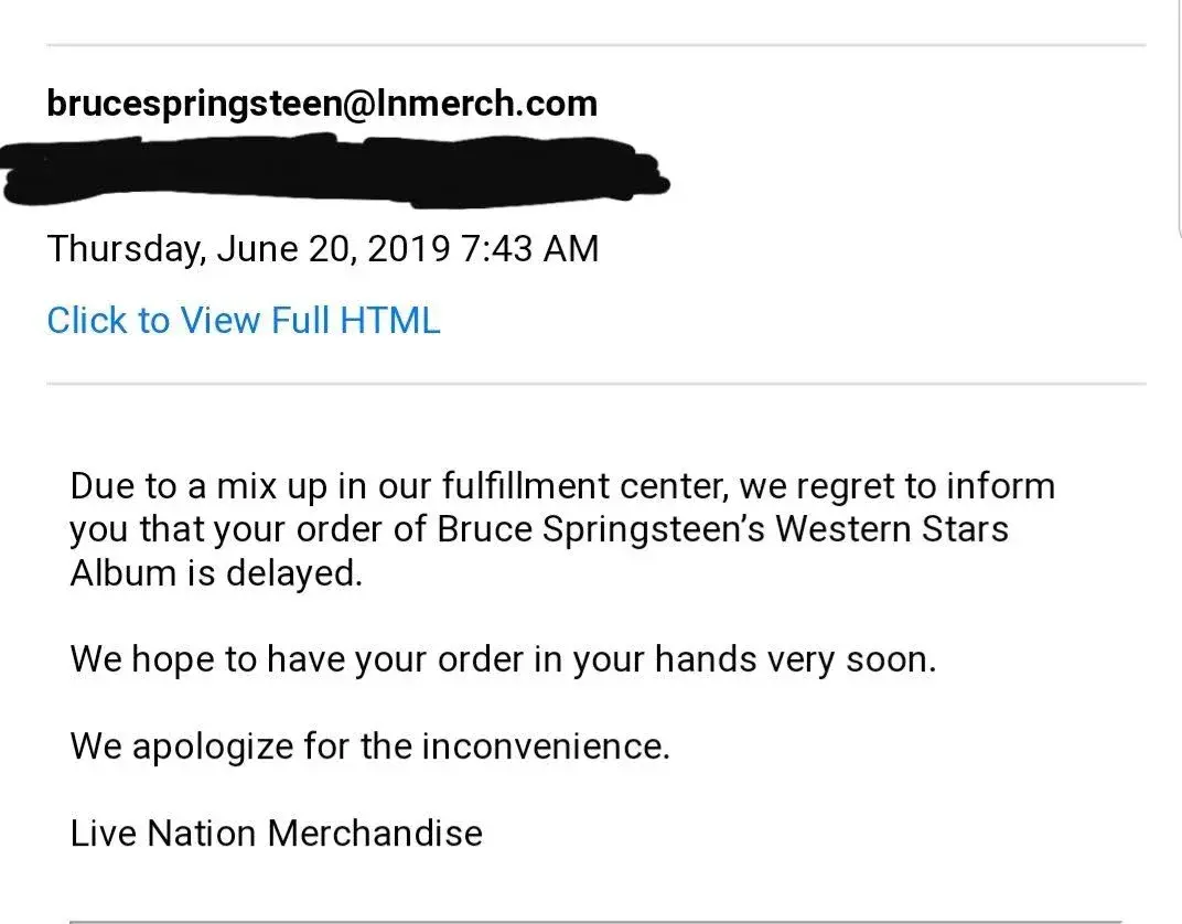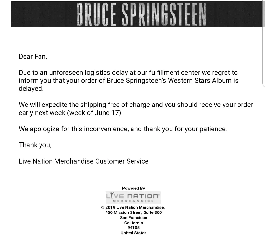 I freakin preordered the new Bruce Springsteen Western Stars CD-TShirt Bundle back in April on the 26th and was SUPPOSED TO GET my stuff the day it officially released last week on June 14th and instead received this bs delay email telling me my stuff was delayed til THIS WEEK(WEEK OF JUNE 17TH) & SHOULD ARRIVE EARLY THIS WEEK BUT NEVER CAME. It is now Thursday June 20th and I go and check my freaking email and get another f@$#%!& delay email. After the first email I hsd tried several flipping times emailing and got jack in return. In other words I got NO RESPONSE and was ignored. I WILL NEVER EVER AGAIN BUY STUFF THAT GOES THROUGH LIVE NATION. F U LIVE NATION. I WANT MY STUFF NOW MOFOS! 😡😡😡😡😡😡😡😡😡