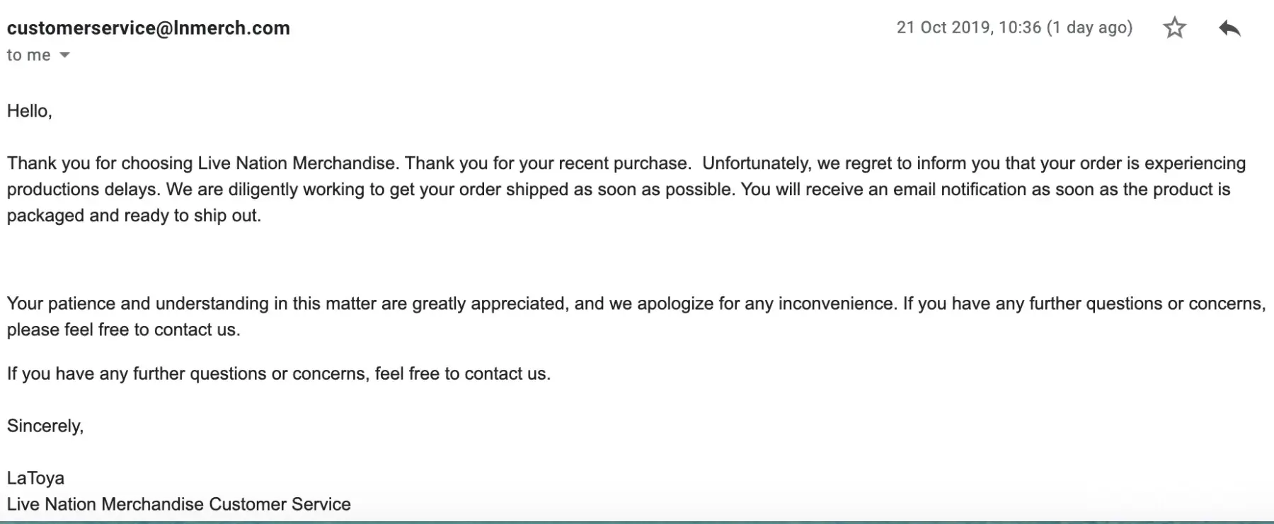 Thank you for choosing Live Nation Merchandise. Thank you for your recent purchase. Unfortunately, we regret to inform you that your order is experiencing productions delays. We are diligently working to get your order shipped as soon as possible. You will receive an email notification as soon as the product is packaged and ready to ship out.