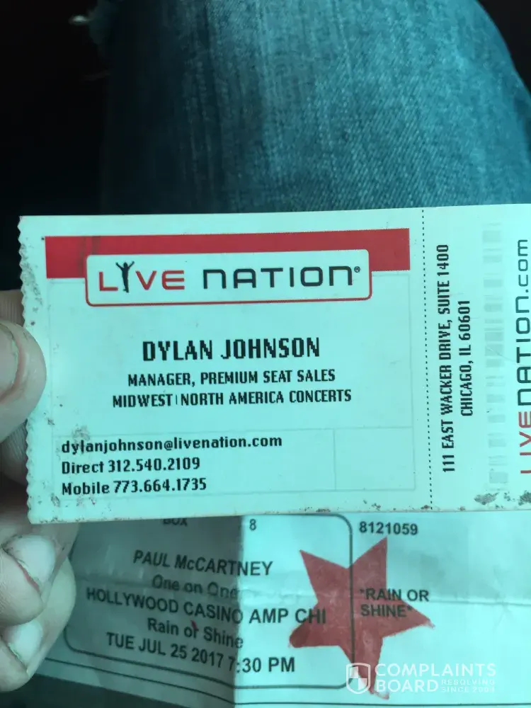 Live Nation completely screwed us over on our tickets to Paul McCartney at Hollywood Casino Amphitheatre Chicago. We bought box seats that had a seat number on them, so as anyone would, we thought we had seats no matter what time we got there. Well that's not the case. As we where walking up the stairs we were told that the seats in the box are "first come first serve" okay that's understandable, but when we got to the box there were not enough seats for our entire group. We didn't even need or ask for all of our seats to be together, there were just not enough seats. We had a group of 5 and there were only 4 available. After speaking with some workers who got their supervisor the supervisor informed us that "bar stools are sold as seats" which is completely unacceptable. If that's how the box works why does my ticket have a seat number on it? Even if it is first come first serve on the seats there should be enough seats for everyone in the box not including bar stools. The girl who was "helping" us told us that "it is the second party ticket distributer that put the seat number on the ticket" when the ticket had Live Nation posted all over it. Then she leaves and says "I'll go get more barstools" she never apologized for the inconvenience, didn't even try to solve the problem. Later as we are still waiting for barstools to be delivered I see her walk by multiple times but never stopped to see if things where okay or to even let us know that barstools are being delivered. It gets to the point where I leave the box as the show is starting to find her, standing next to another manager watching the show with a better view than my entire group who paid for box tickets. When I confronted her and asked what happened and why she never came back to our box she stood there speechless and her coworker Dylan Johnson jumps in and doesn't help the situation at all. He does the same song and dance saying that it's the second party distribution company but ignoring that live nation is posted everywhere on the ticket INCLUDING LIVE NATION COPYRIGHT! I also complained that this girl never came back to our box to talk to us, she basically just bailed on us. He then wanted to argue that "she put in a request for more barstools but we are sold out so there aren't any more..." great. Why didn't she come tell us that? Why was there never an apology? Instead Dylan wanted to argue with me instead of handling the problem. I was furious and left the area. After cooling off for a second I went back out to get names. When I found them I asked for both of their names. Dylan was happy to give me his card like that was going to fix the problem. I asked the girl her name and card but she just gave me a name and couldn't even bother to stop walking or to look me in the eyes while doing it. I'm pretty sure she said her name was Sarah and I'm sure that Dylan knows exactly who she is. Everything about this experience through Live Nation Chicago and Hollywood Casino Amphitheatre, Tinley Park was terrible and we do not plan on returning ever. At no point during the sale of the ticket, while going through the VIP line, or even sitting in the extremely over priced VIP lounge where we told that seats are first come first served. If we had known that there probably wouldn't be a issue but instead the ticket is made to look like everyone in my group was guaranteed a seat and that was not the case. It was not the second party ticket distribution company. Everything on the ticket said Live Nation. Not only was the ticket a complete scam to sell more tickets, but the people working for live nation where completely rude, did not communicate, and where more interested in watching the show (while getting paid to work while ticket holders can't see the stage) it is completely unacceptable and I'm looking for a response back as soon as possible.